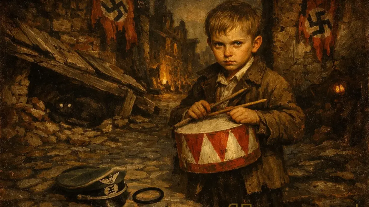 Барабан. Голос, разбивающий стекло. И взгляд изнутри, снизу, из-под колен взрослых — на нацизм, на войну, на смерть, на секс, на ложь, на Данциг 1930-х годов. Грасс написал это в 1959-м. Немцы тогда ещё не очень-то любили ворошить своё недавнее прошлое; многие предпочитали аккуратно забыть, кем были десять лет назад. И вот тут появляется карлик с барабаном и начинает орать — в буквальном смысле: его голос разносит витрины в мелкую крошку.