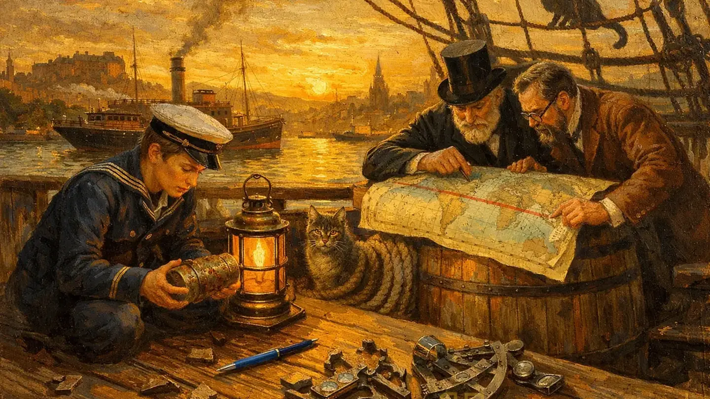 — Бумага европейская, — сказал Паганель, поправляя очки, которые немедленно съехали обратно на кончик носа. — Тип чернил — железогалловые, стандартные для морского ведомства. Цилиндр — медный, без клейма. Возраст... хм. Три года. Может быть, четыре. Коррозия указывает на теплые воды — Средиземное море или... — он запнулся.