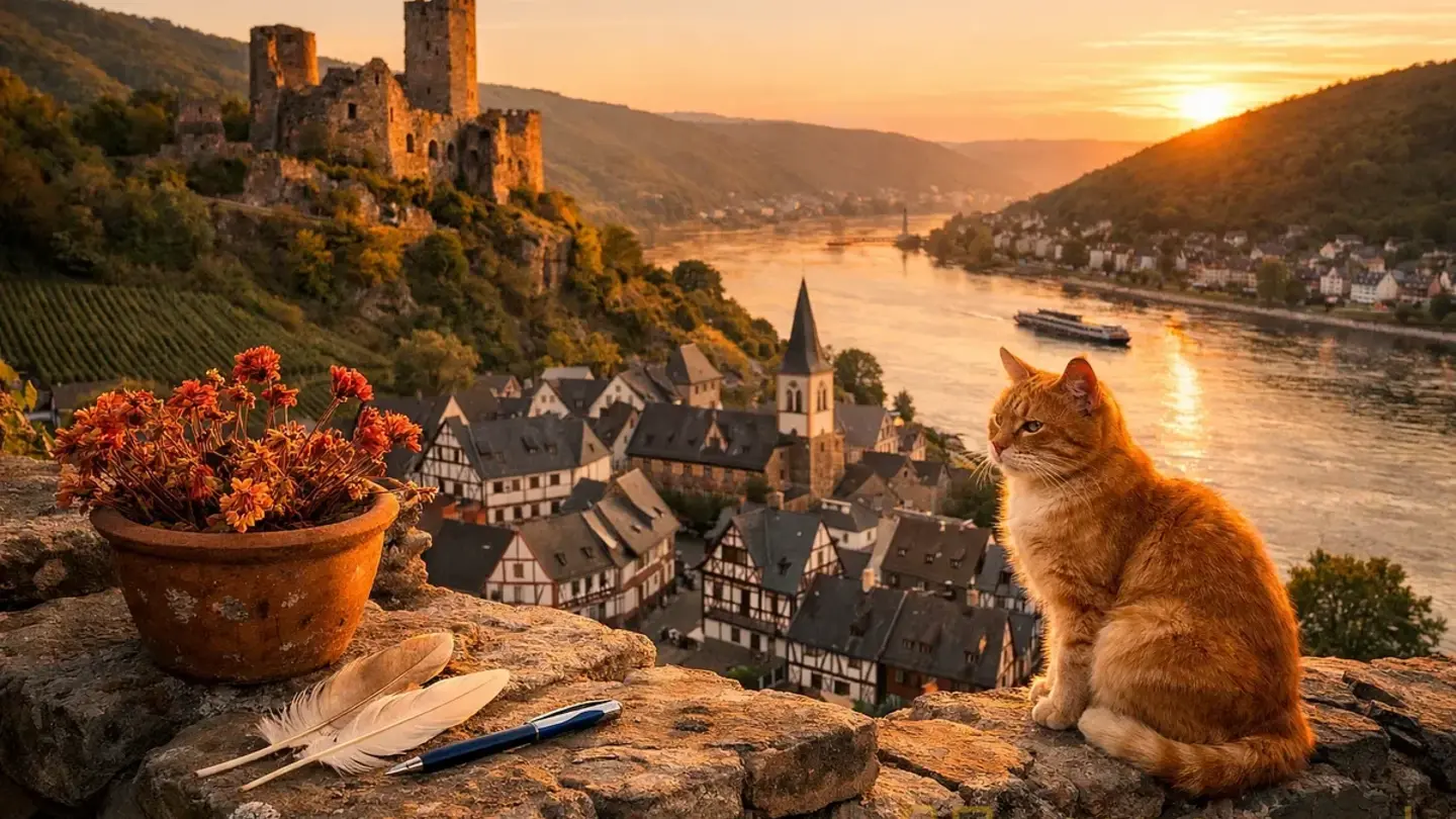 *[Фото: вид на Рейн с холма, закат, маленький немецкий городок внизу]*
