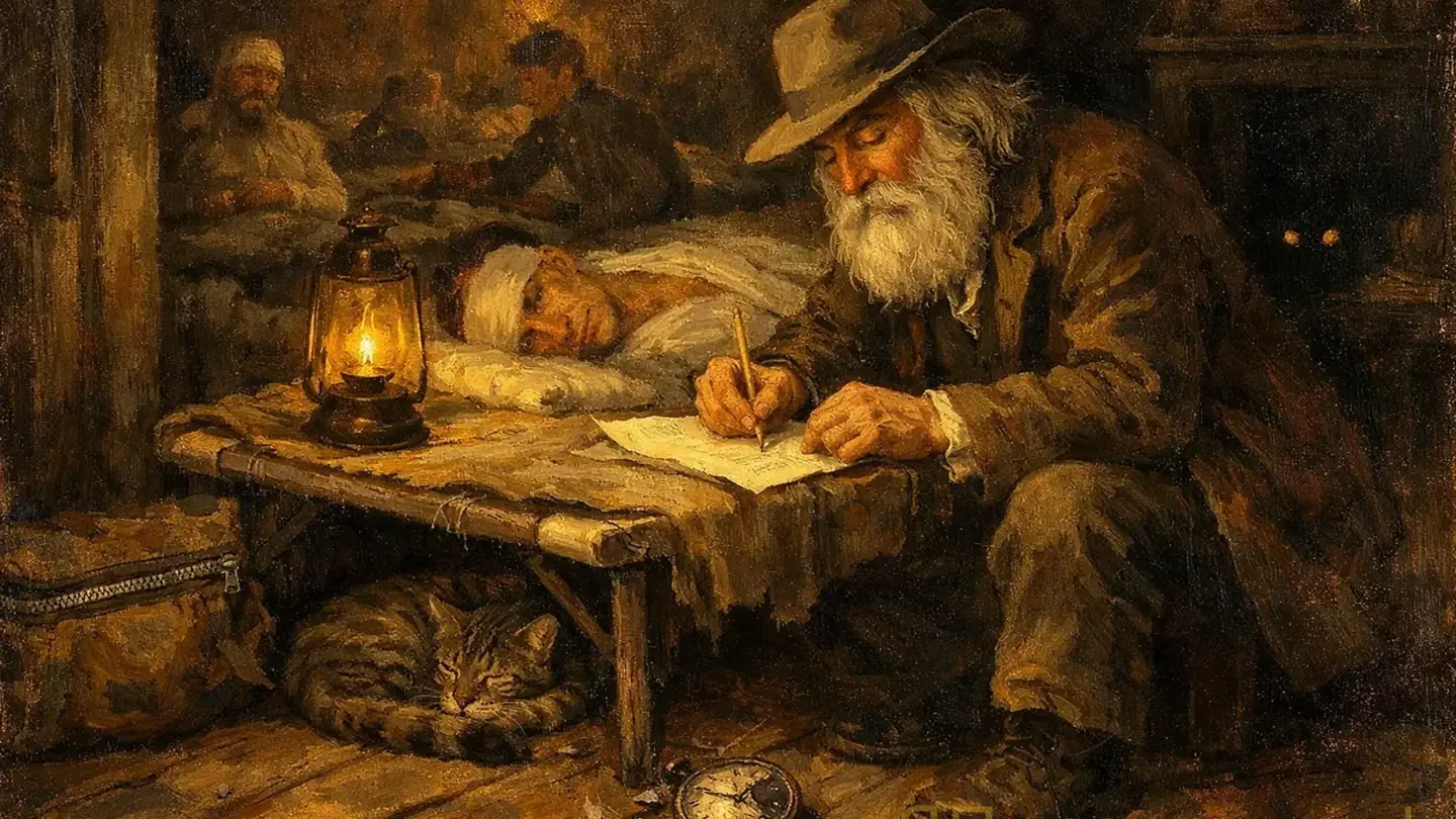 Во время Гражданской войны Уитмен работал добровольцем-санитаром в военных госпиталях Вашингтона. Годами. Он сидел у кроватей умирающих солдат — конфедератов и юнионистов вперемешку, ему было всё равно. Писал письма домой за тех, кто не мог писать сам. Читал вслух. Просто сидел рядом, когда человеку не нужны слова, только присутствие. Его «Барабанный бой» и «Когда во дворе перед домом цвела этой весной сирень» — не патриотические оды, не военный пафос. Это что-то вроде репортажа из места, где умирают. Без украшений. Просто люди умирают, и он это записывает. Педантично, с именами, с датами, с деталями, которые уже не нужны никому — кроме поэзии.