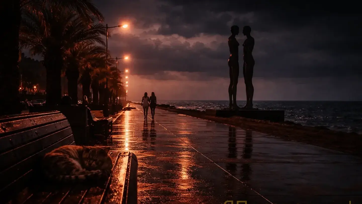 Лика фотографировала скульптуру «Али и Нино» — ту самую, на бульваре, два металлических силуэта, которые каждый вечер движутся навстречу друг другу, проходят сквозь и расходятся. Вечная встреча, вечная потеря. Банально? Может быть. Но в двенадцатом часу ночи, когда бульвар пустеет и море бормочет что-то невнятное в темноту, эта штуковина пробирает до костей.