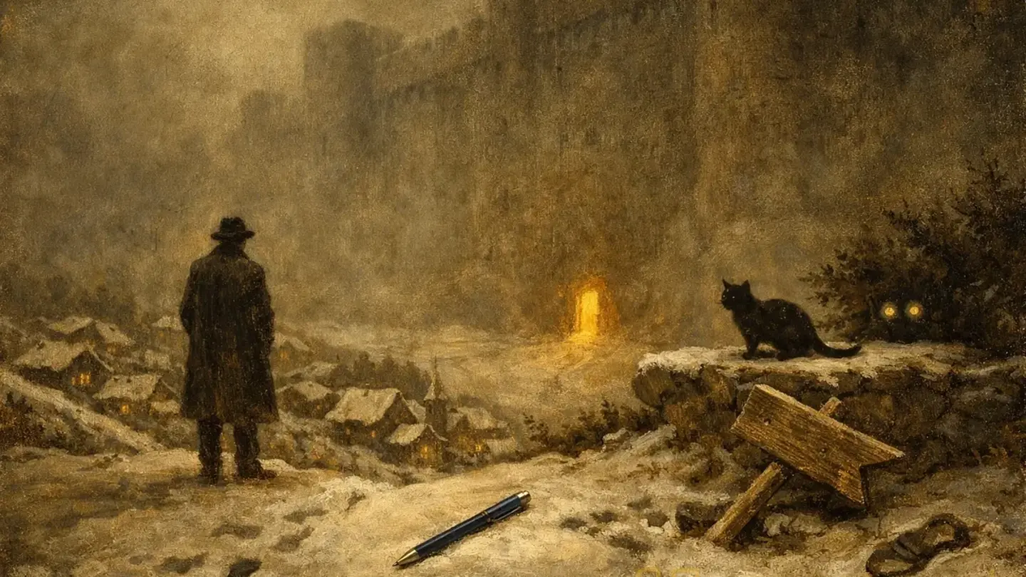 Деревня лежала в предрассветных сумерках, и снег скрипел под сапогами так громко, что К. казалось — его слышат все. Дома стояли тёмные, слепые; ни одного огонька. Только далеко, на холме, в окнах Замка горело что-то — не свет, а скорее отсутствие темноты, если такое возможно. К. много раз пытался определить, что именно он видит, когда смотрит на Замок ночью, и каждый раз приходил к выводу, что определить невозможно.