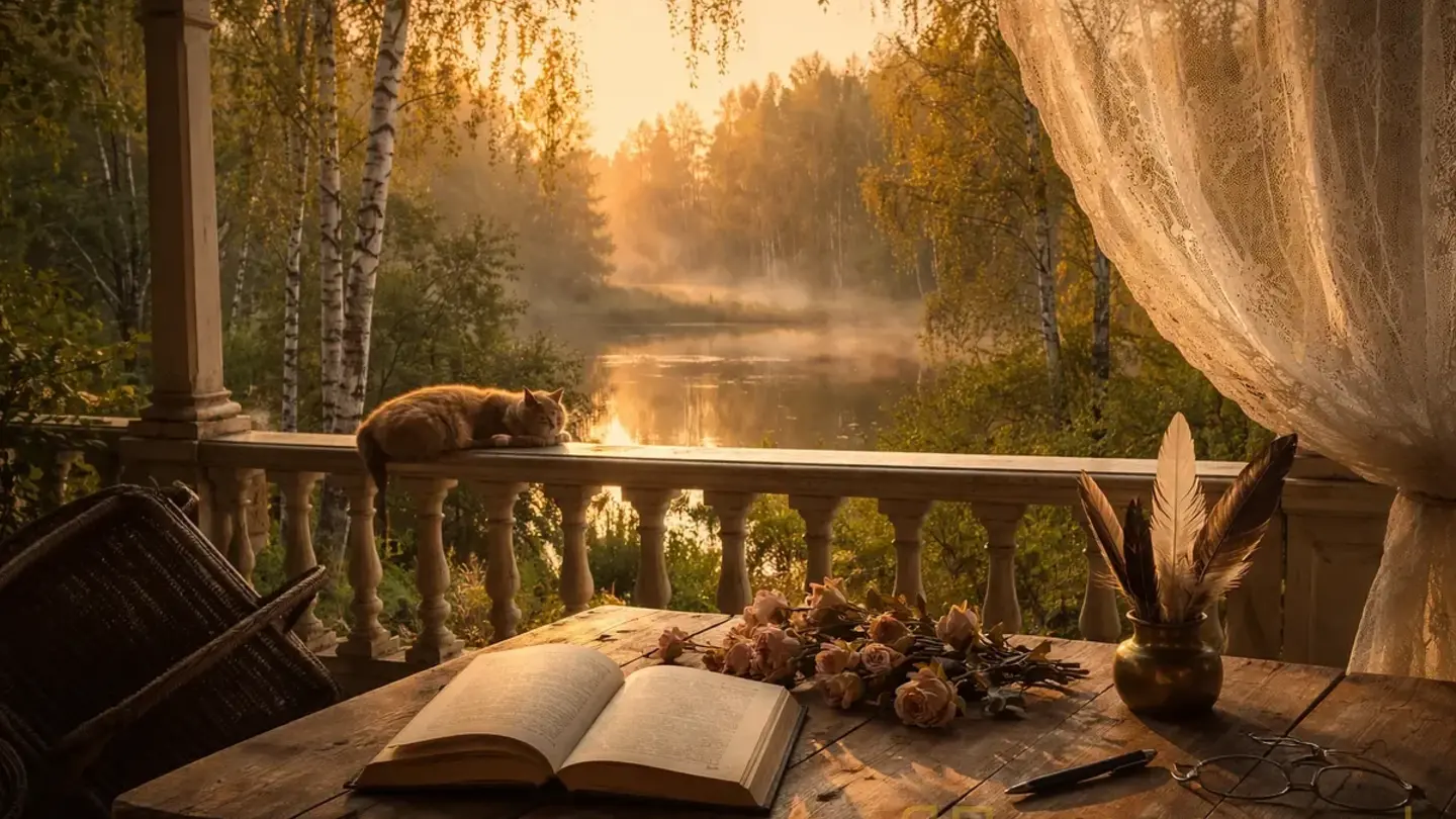 *[Фото: закат над прудом, на переднем плане книга в траве]*