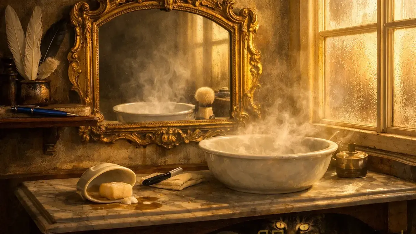 [Фото: зеркало в ванной комнате, запотевшее после умывания, на полочке бритва и помазок]