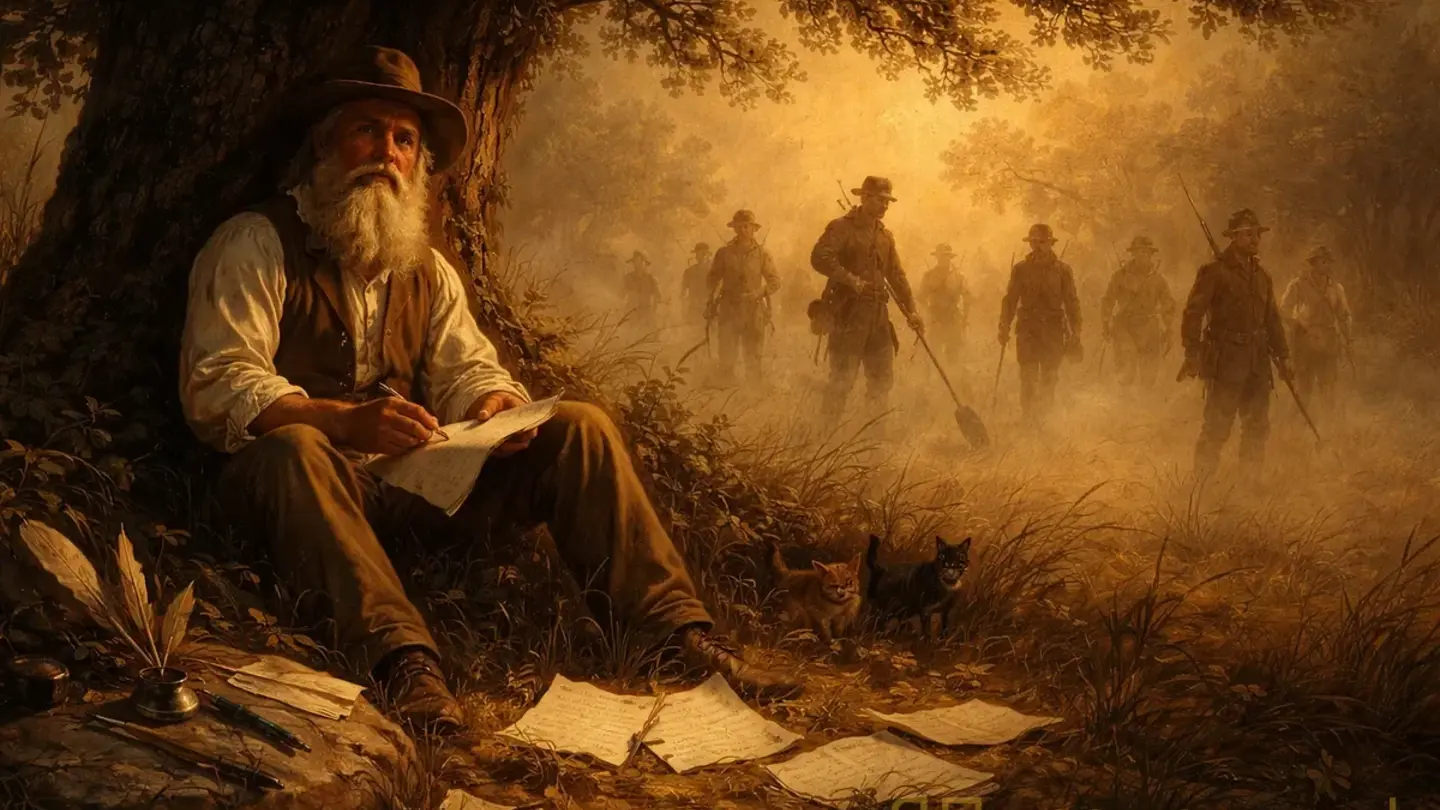 Парадокс. Вот в чём штука с Уитменом — он был одновременно невыносимым эгоцентриком и человеком, который реально любил людей. Не абстрактное «человечество», а конкретных людей. Во время Гражданской войны он три года ходил в госпитали — добровольно, без зарплаты — и сидел у постелей умирающих солдат. Писал за них письма домой. Держал за руку. Просто был рядом. Тысячи визитов. Он это называл «моей войной»; написанное им тогда — цикл «Барабанный бой» — до сих пор одно из лучших, что создавала американская военная поэзия. Жёсткое, без пафоса, с запахом гангрены и хлороформа.