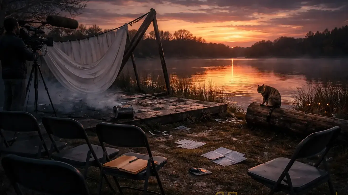 [Камера: панорама. Озеро, камыши, остатки заката — багровая полоса у горизонта, будто кто-то провел пальцем по ране. Самодельная сцена: два столба, простыня вместо занавеса, едкий запах серы от дымовых шашек.]