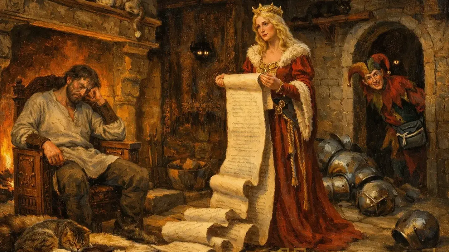 Именно в этот момент — а в хрониках подобные моменты всегда наступают с точностью, подозрительной для реальной жизни — дверь распахнулась, и в зал ввалился Вамба. Колпак его был набекрень (впрочем, он был набекрень всегда), камзол порван (последствия конюшни), а в руке он сжимал пергамент.