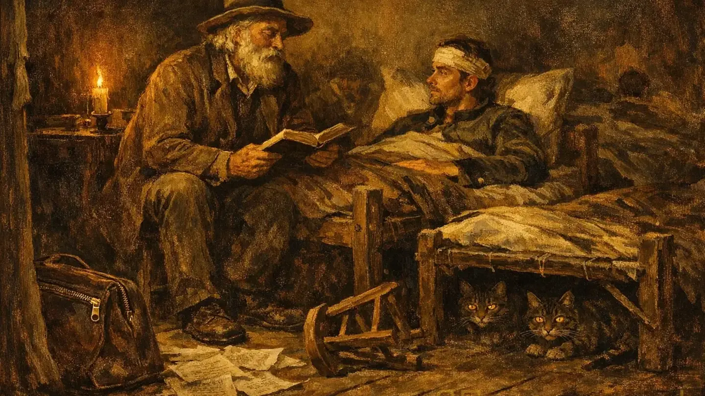 Гражданская война. Уитмен работал волонтёром в военных госпиталях Вашингтона — не врачом, а утешителем; сидел рядом с умирающими, писал за них письма домой, читал вслух, просто держал за руку. Потом написал об этом — «Барабанный бой», «Когда во дворе перед домом цвела сирень». Другие стихи. Тише. Тяжелее. Как будто земля под ними промёрзла.