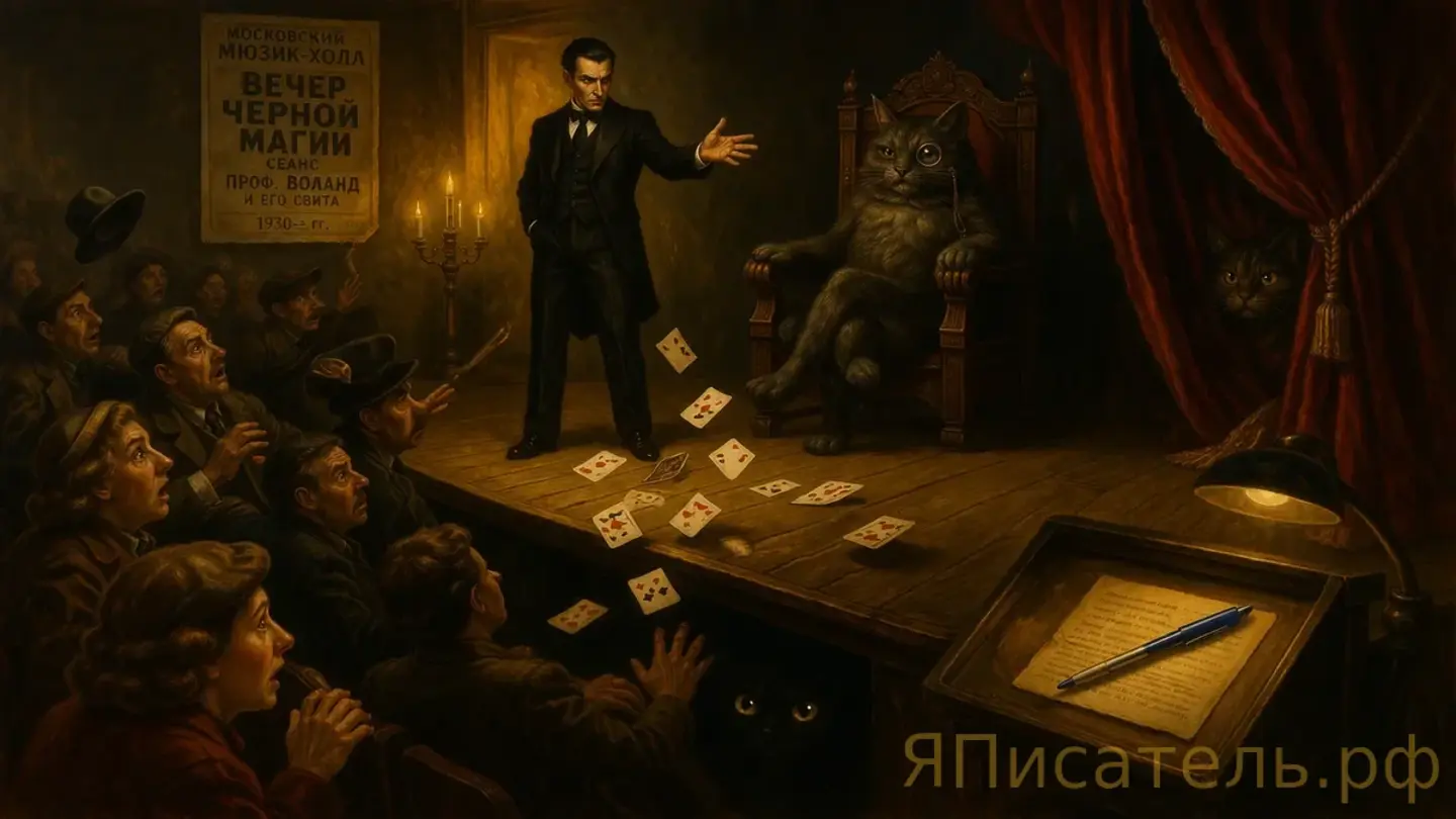 ИВАН: Весь город рассказывал. Черная магия. Фокусы — нет, не фокусы; фокусы — это когда голубь из шляпы. А когда зрителям сыплются деньги с потолка, а потом деньги превращаются в бумажки — это не фокусы. Это издевательство. Или урок. Воланд вообще любил уроки. Жестокие, изящные, с подвохом; как учитель, который ставит двойку не за незнание, а за то, что ты даже не попытался подумать.
