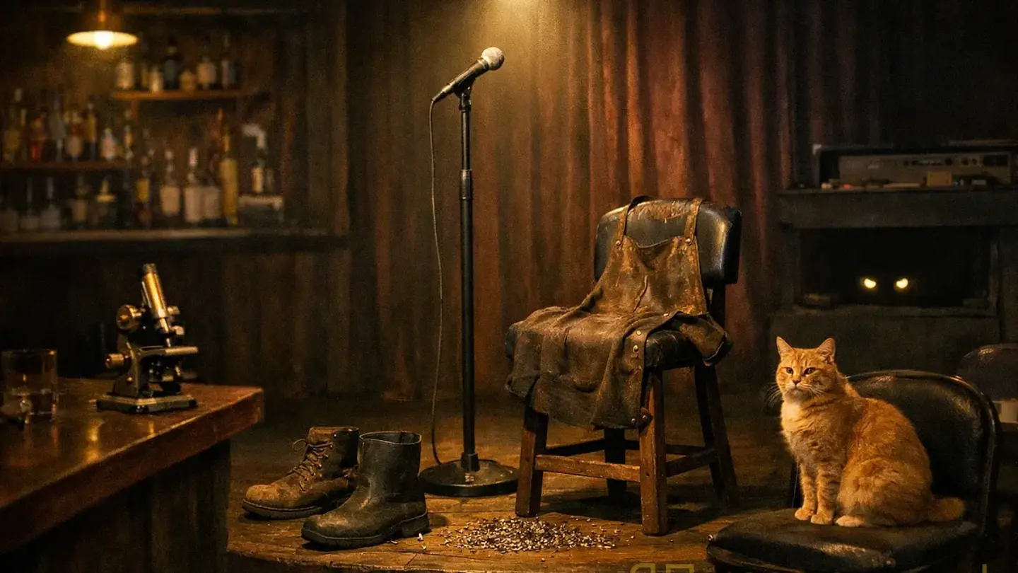 *[На сцену выходит мужик. Невысокий, косой на один глаз, в кожаном фартуке с подпалинами. На ногах — два разных сапога. Берет микрофон, как молоток — уверенно, снизу.]*