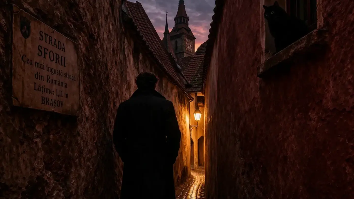 Вечер. Они шли по Strada Sforii — той самой, полтора метра, плечом к стене. Раду впереди; его пальто касалось обоих стен. Лина за ним. Узкая щель между зданиями, небо наверху — тонкая полоска, уже темнеющая. Где-то в переулке мяукнула кошка — тощая, пятнистая, метнулась из-под ног и исчезла в щели, которая казалась уже, чем она сама.