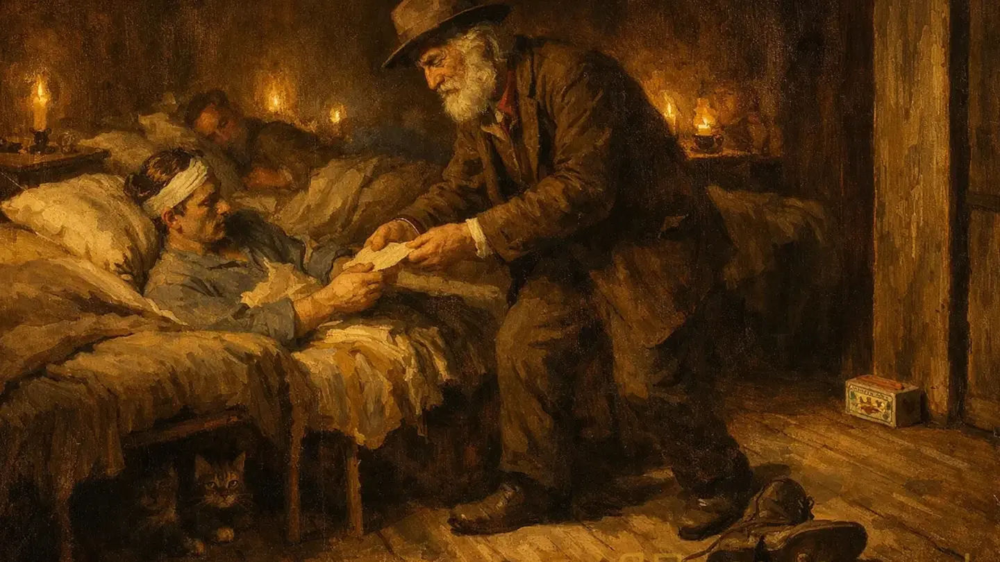 Была Гражданская война. Уитмен не воевал — возраст, нездоровье. Но добровольно пошёл санитаром в военные госпитали Вашингтона. Не на неделю — на несколько лет. Тысячи раненых. Писал письма домой для умирающих солдат — от их имени, потому что сами они уже не могли держать перо. Ходил между койками и раздавал бумагу, конверты, марки, иногда конфеты и табак. Это его что-то изменило — в груди, там, где у людей что-то живёт помимо рёбер. После войны его стихи стали другими: медленнее, тяжелее, как у человека, который слишком много видел и перестал торопиться объяснять.