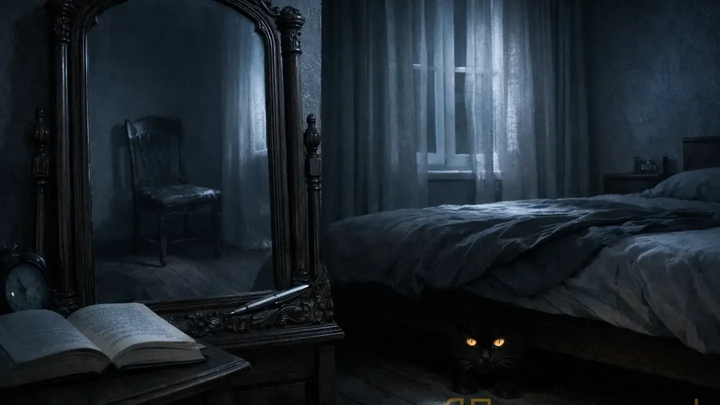 Катя сидела на кровати, листая телефон, и краем глаза увидела своё отражение. Всё было нормально, кроме одной детали: в зеркале книга на прикроватной тумбочке лежала обложкой вверх. А в реальности — корешком к ней. Катя посмотрела на книгу. Посмотрела в зеркало. Несовпадение было очевидным.