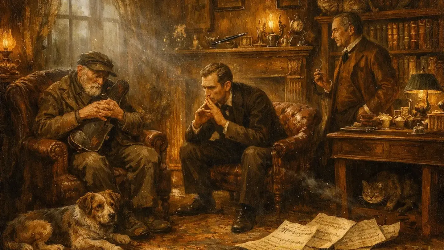 Миссис Хадсон ввела в комнату старика. Он был невысок, худ, одет в чистый, но заметно поношенный сюртук. Левой рукой он крепко прижимал к себе футляр от скрипки, а правой держался за поводок крупной лохматой дворняги, которая уверенно вела его между стульями. Глаза старика были закрыты тёмными очками, но даже без них стало бы ясно: этот человек не видит.
