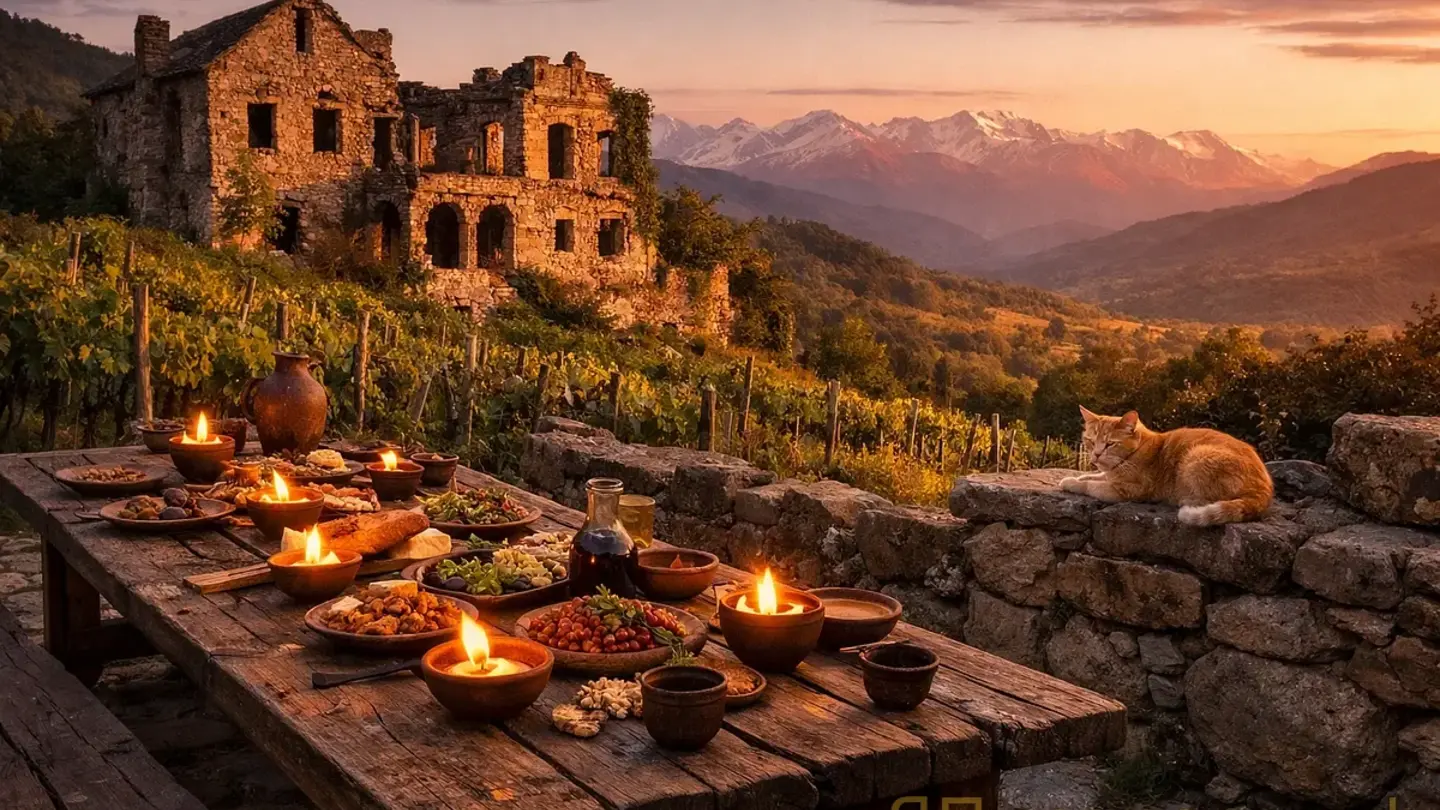 Вечером Гия накрыл стол во дворе: лаваш, сулугуни, зелень, ткемали, цыпленок на углях. Свечи — толстые, церковные, в глиняных плошках. Вокруг — виноградники, за ними — горы, темные хребты Кавказа, и закат был таким, что Марина положила камеру и просто смотрела, потому что фотография не передала бы и десятой доли.