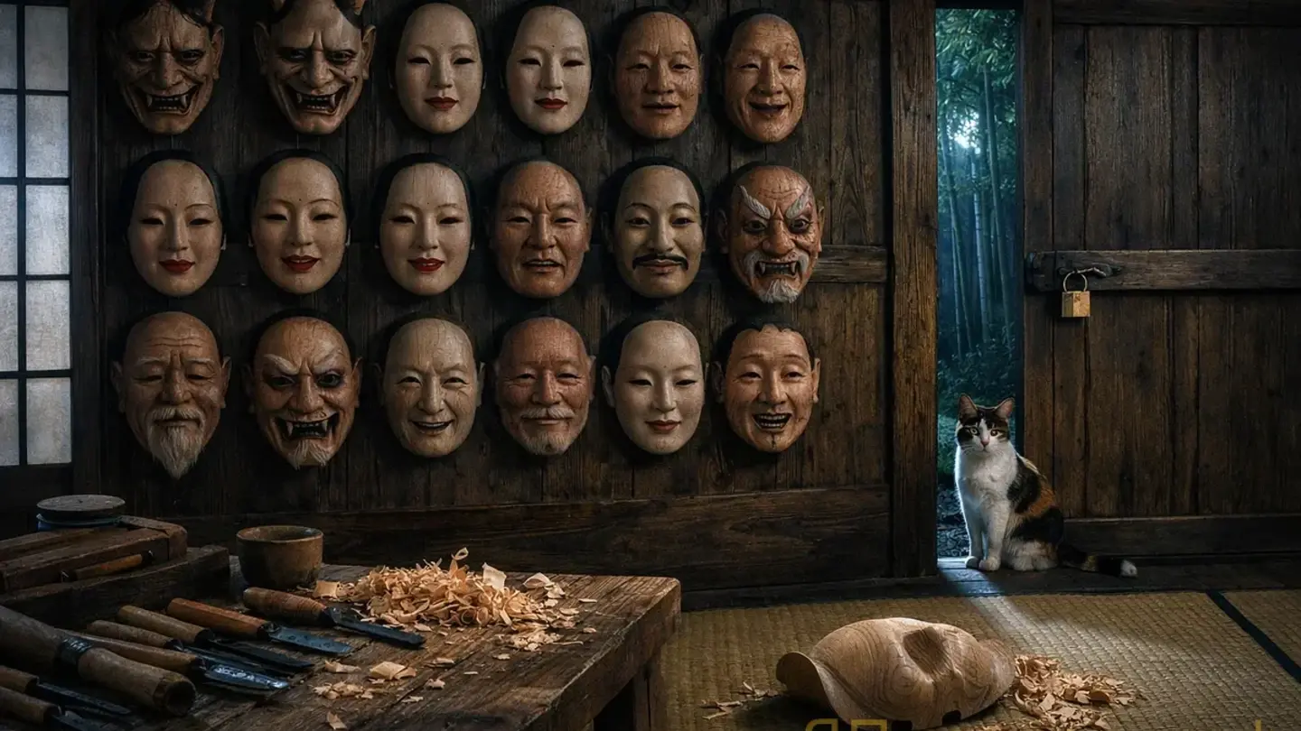 На стене маски висят. Дима посчитал — двадцать семь. Женские, мужские, демонические, божественные. Каждая мастерство. Но дело не в этом. Текстура. Поры. Морщинки, как будто лицо жило, старело. Одну потрогал — ко-омотэ, юная, полуулыбка, полуслезы.