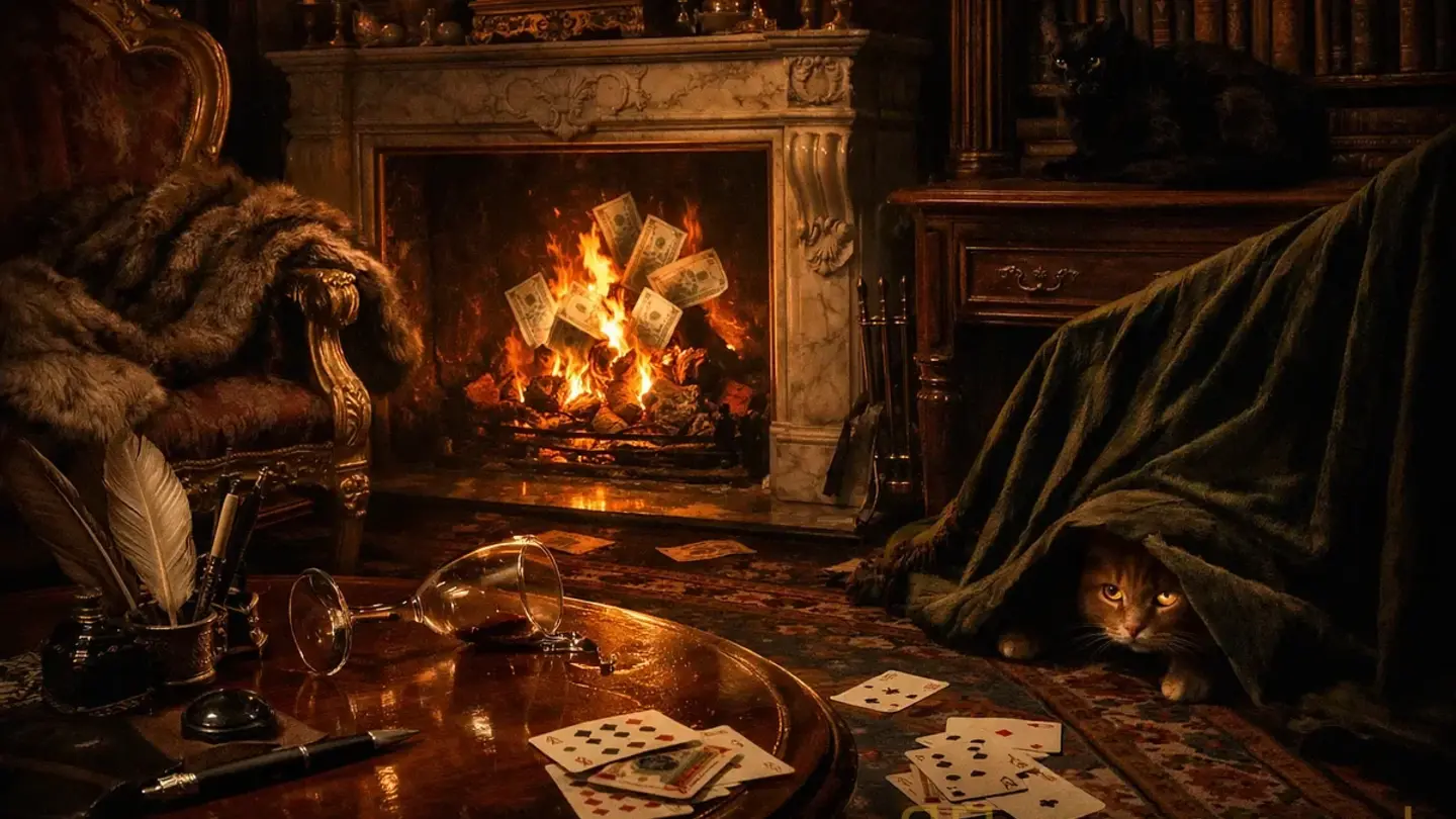 [Видео: камин горит, рука с пачкой денег медленно приближается к огню]