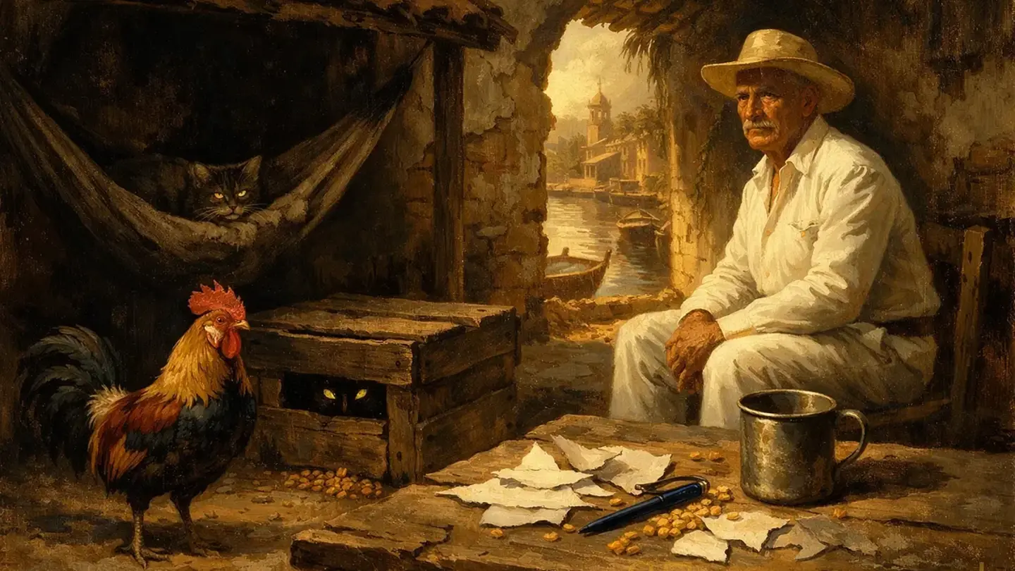 Он проснулся на рассвете от крика петуха. Петух вышел из ящика, расправил крылья и ударил шпорой по земле — коротко, точно, как боксёр, проверяющий удар. Полковник смотрел на него и думал, что в январе, когда петух выйдет на арену, он, полковник, будет стоять в первом ряду — голодный, в латаном костюме, с пустыми карманами — и это будет правильно. Потому что есть вещи, которые важнее еды, и важнее денег, и важнее писем, которые не приходят.