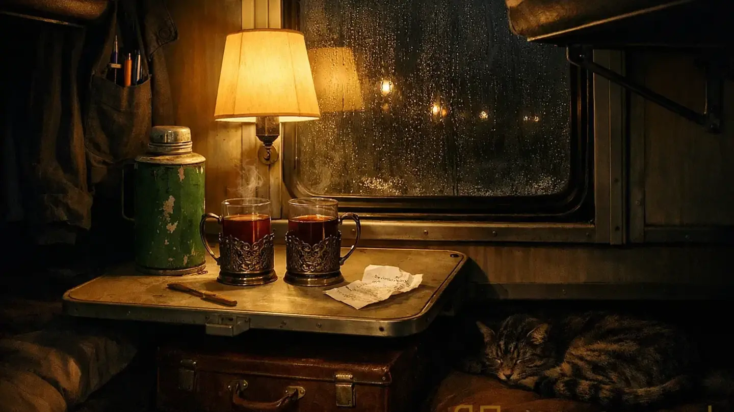 Купе пустое. На столе — подстаканник с чаем и пачка печенья «Юбилейное». За окном — темнота. Не городская, разрезанная фонарями, а ровная, глухая, октябрьская. Поля или леса — не разберёшь.