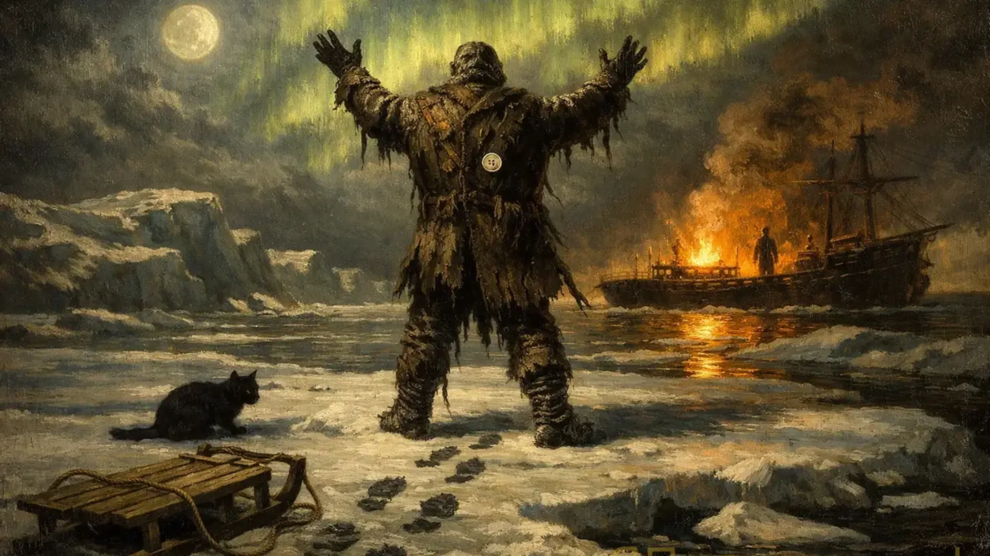 Три дня спустя, когда мы развернули корабль на юг, впередсмотрящий крикнул с мачты. Я поднял подзорную трубу. На льдине — далёкой, почти за пределами видимости — стояла фигура. Огромная. Неподвижная. Как монумент, возведённый безумным скульптором посреди Арктики.