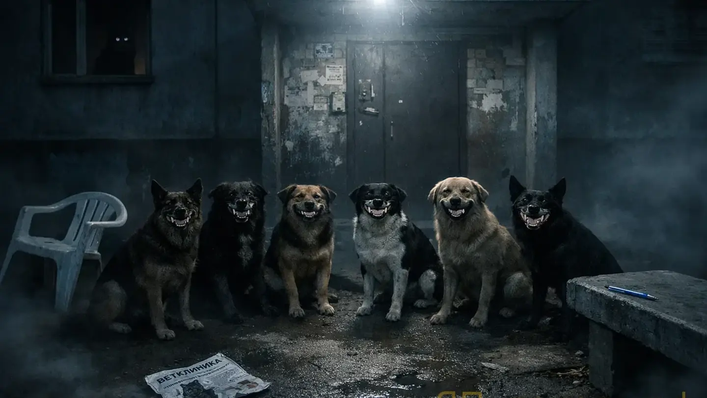 Семь собак сидели полукругом у входа в подъезд. Разных пород — нет, не пород, какие породы у дворняг, — разных размеров и мастей. Одна рыжая, крупная, с рваным ухом. Две поменьше, чёрные, похожие друг на друга, как близнецы. Ещё одна — седая, старая, с провисшим животом. Остальные — обычные, никакие, из тех, что видишь у помоек и тут же забываешь.
