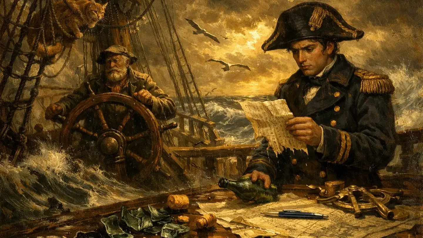 Роберт стоял на шканцах и смотрел, как Пиготт вертит её в руках. Тёмно-зелёное стекло, горлышко, запечатанное варом. Внутри — что-то белое. Свёрнутое. Желтоватое от времени или от морской воды — поди разбери.
