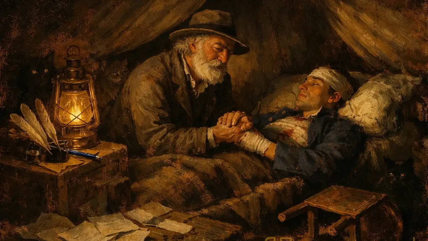 А потом началась Гражданская война. Уитмен записался добровольцем — не солдатом, а медбратом. Три года он провёл в вашингтонских военных госпиталях: перевязывал раны, писал письма за солдат, которые не могли держать ручку, сидел у кроватей умирающих и просто держал их за руки. Десятки тысяч посещений. Современники вспоминали, что от него исходило что-то вроде... не знаю, спокойствия? Уверенности в том, что смерть — это тоже нормально. Это тоже часть жизни. Именно тогда он написал «О Капитан! Мой Капитан!» — плач по убитому Линкольну, который знают все американские школьники. И это при том, что сам Уитмен считал это стихотворение второсортным по сравнению со своими главными вещами. Самое известное произведение поэта — то, которое сам поэт не особенно ценил. Вот такой парадокс.