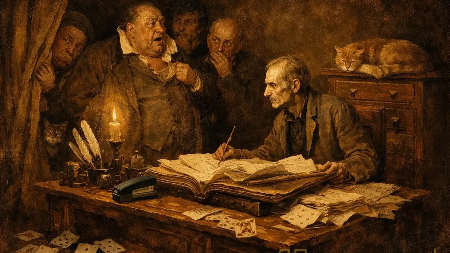А наказание — вот оно. Сидит в сером сюртуке. Не пьёт. Не берёт. Не смеётся. И знает арифметику.
