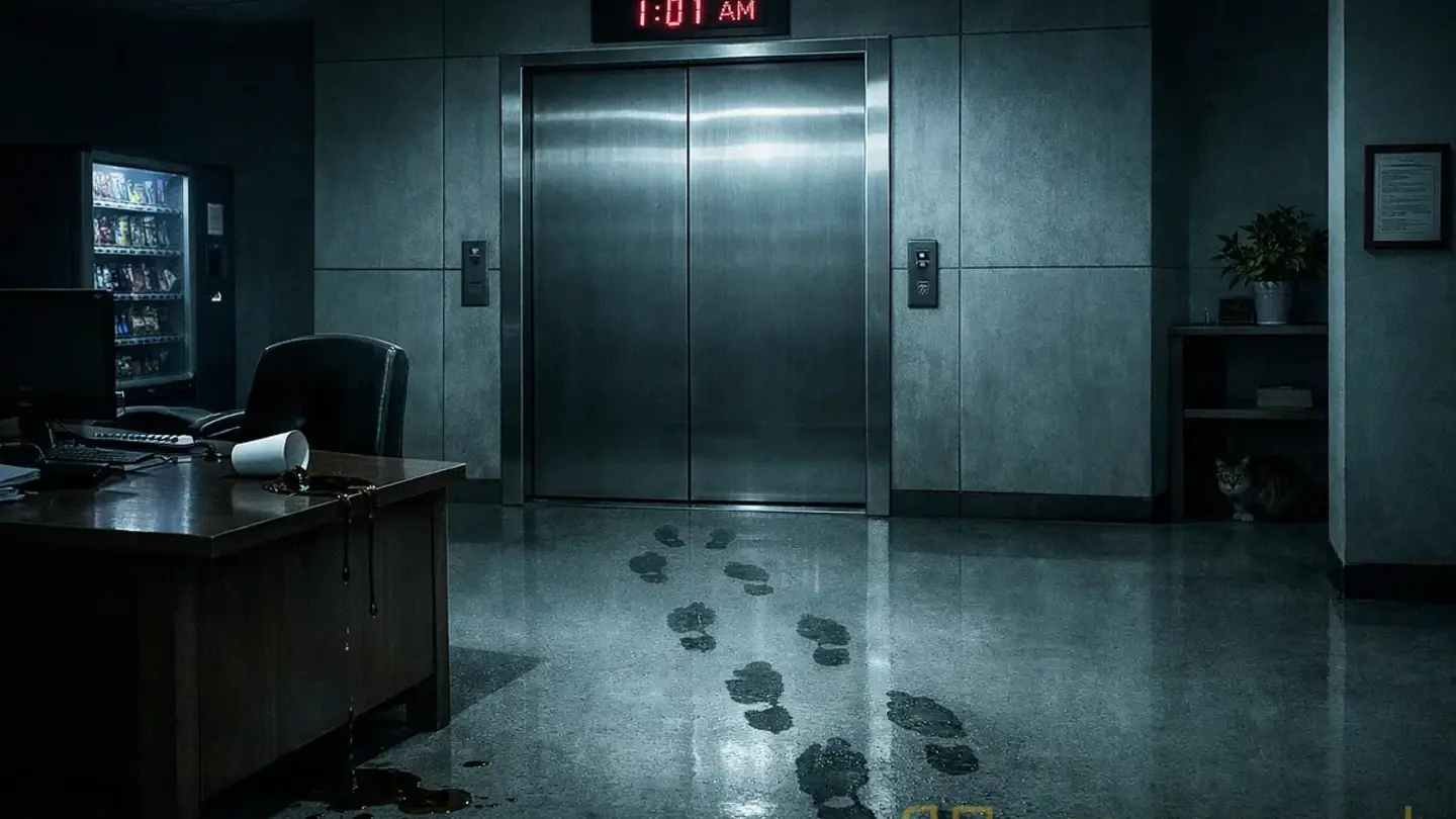 На стуле лежал журнал посетителей с влажными краями. Последние строки были заполнены одинаковым временем — 01:01. В каждой строке: «Проверил кнопку между этажами». Подпись внизу была его. Не похожая. Его. Никита захлопнул журнал так резко, что лампа мигнула, и в темноте на секунду стало слышно, как кто-то встает со второго стула, которого там не было.