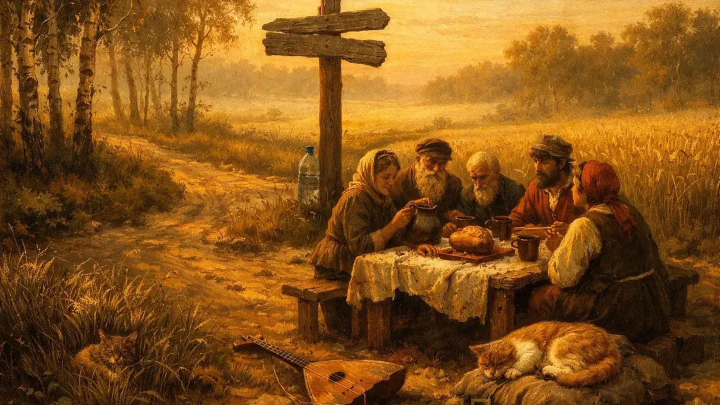 Мужики переглянулись и тоже сели. Скатерть-самобранка, давнее их чудо, была уже потрёпана и кормила не так обильно, как прежде, но всё ж расстелили её, и на ней явились хлеб, квас, огурцы и каша — еда простая, мужицкая, но после долгой дороги и она казалась пиром.