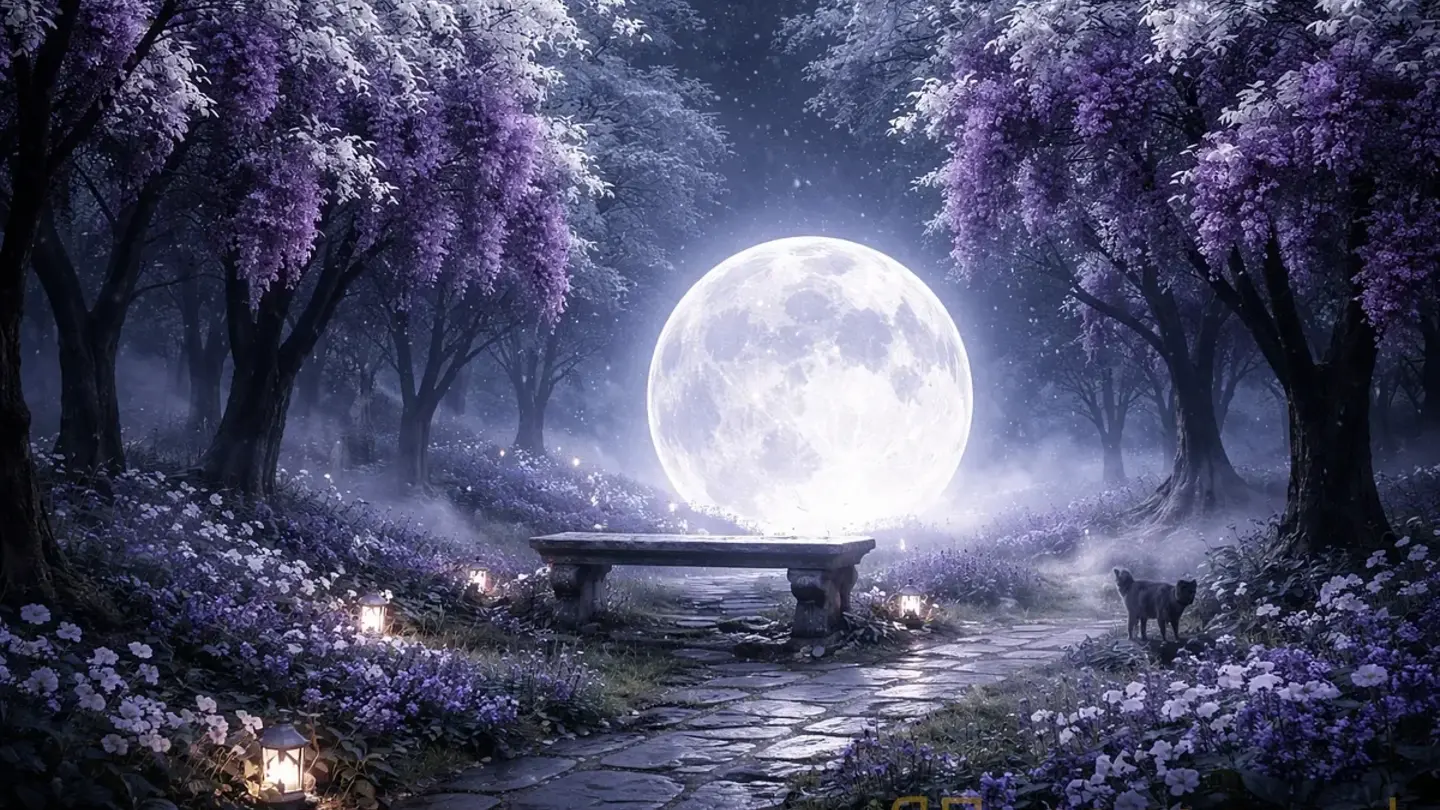 Он стоял в саду — не Летнем, другом. Сад был странным: деревья с чёрной корой и белыми листьями, а вместо солнца — огромная луна, висящая так низко, что казалось, можно дотянуться рукой. И сирень — повсюду сирень, тяжёлые гроздья, фиолетовые и лиловые, свисающие с веток как виноград.