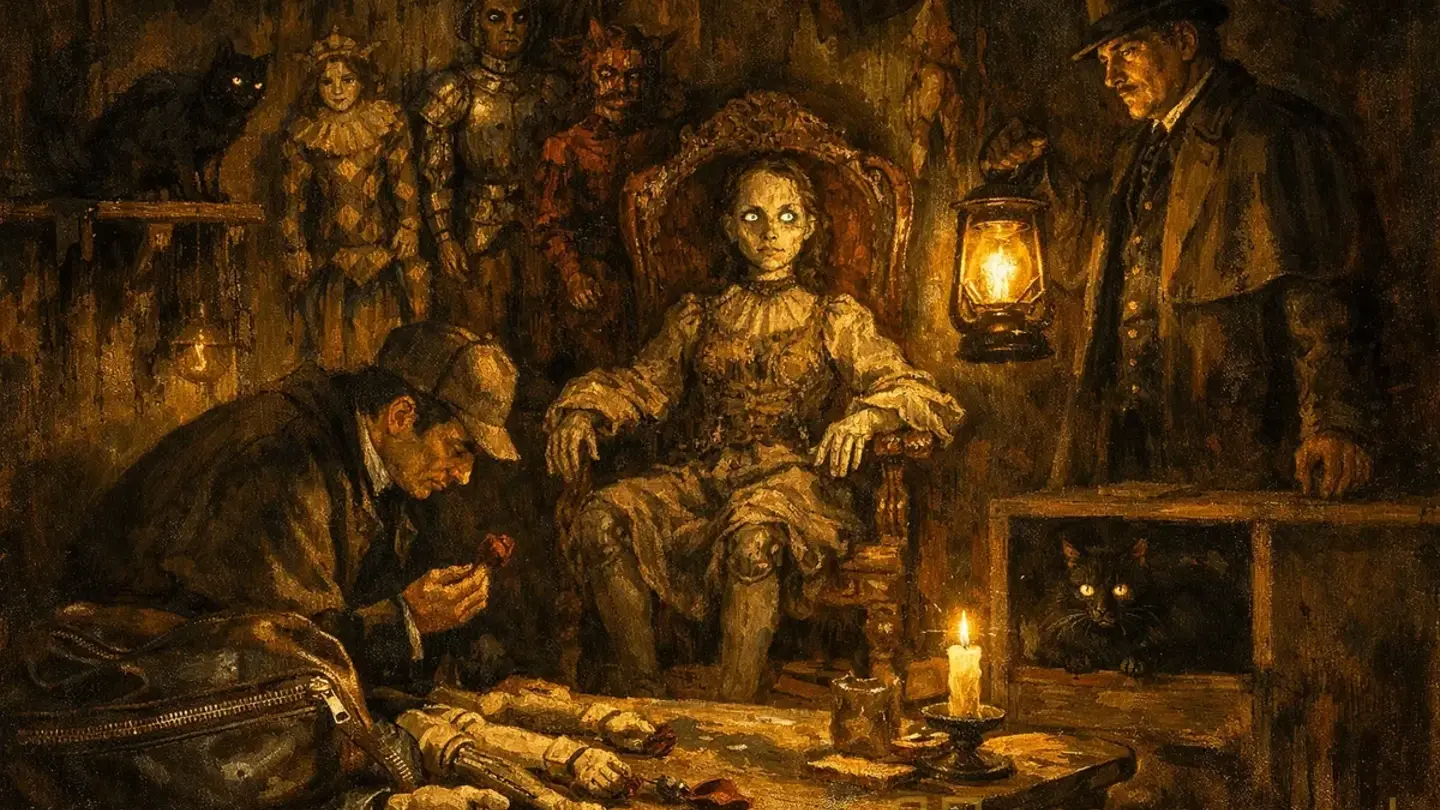 Но самое поразительное ожидало нас в центре комнаты. Там стояло резное деревянное кресло с высокой спинкой, и в нём сидела кукла — в человеческий рост. Закинув ногу на ногу. Со стеклянными глазами, которые ловили свет полицейского фонаря и, казалось, следили за каждым нашим движением.