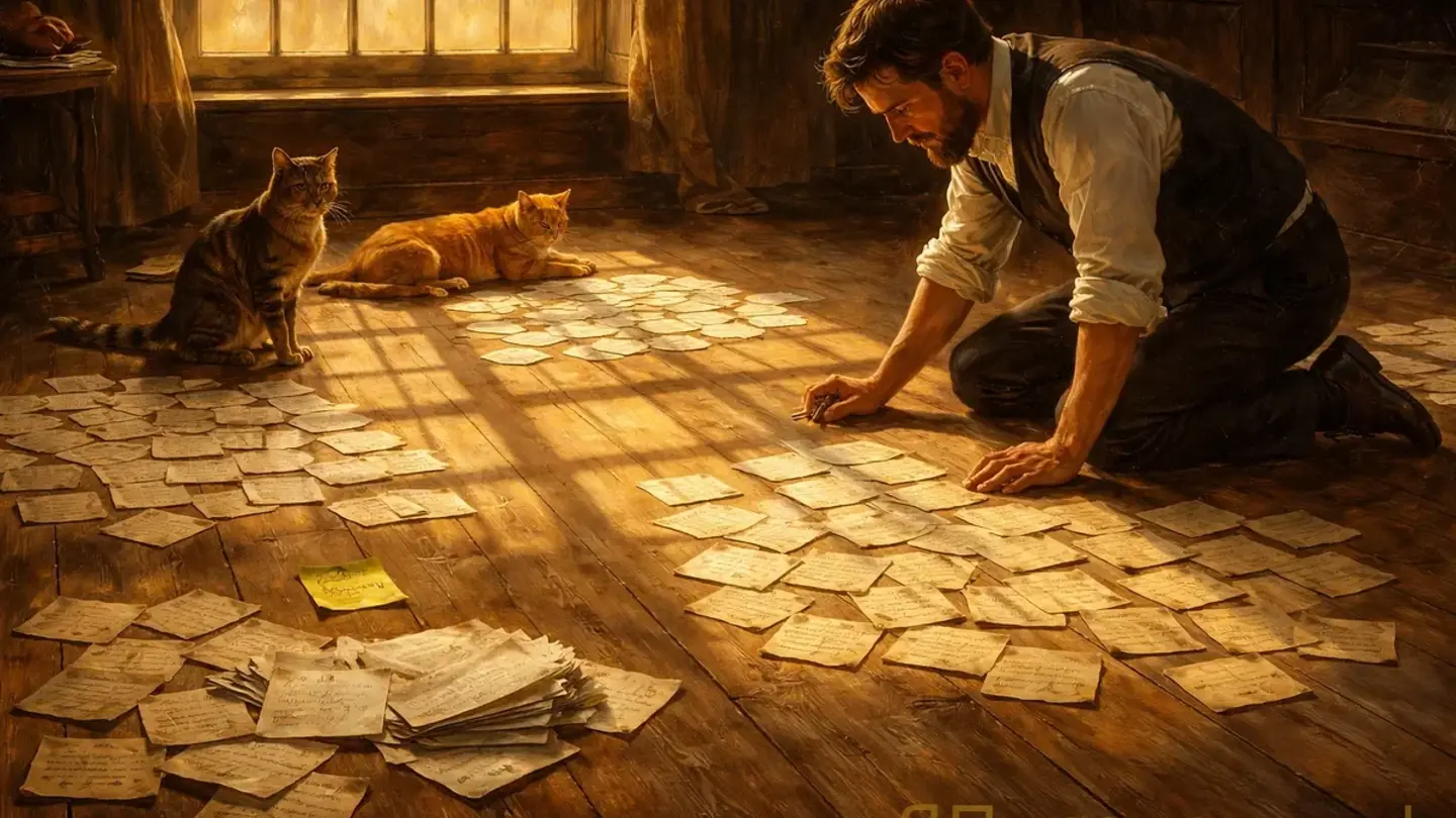 Метод карточек. Напишите каждую сцену или главу на отдельном листе. Разложите на полу. Теперь смотрите на порядок со стороны — как режиссёр на монтажный стол. Какие сцены можно переставить? Где ритм провисает?