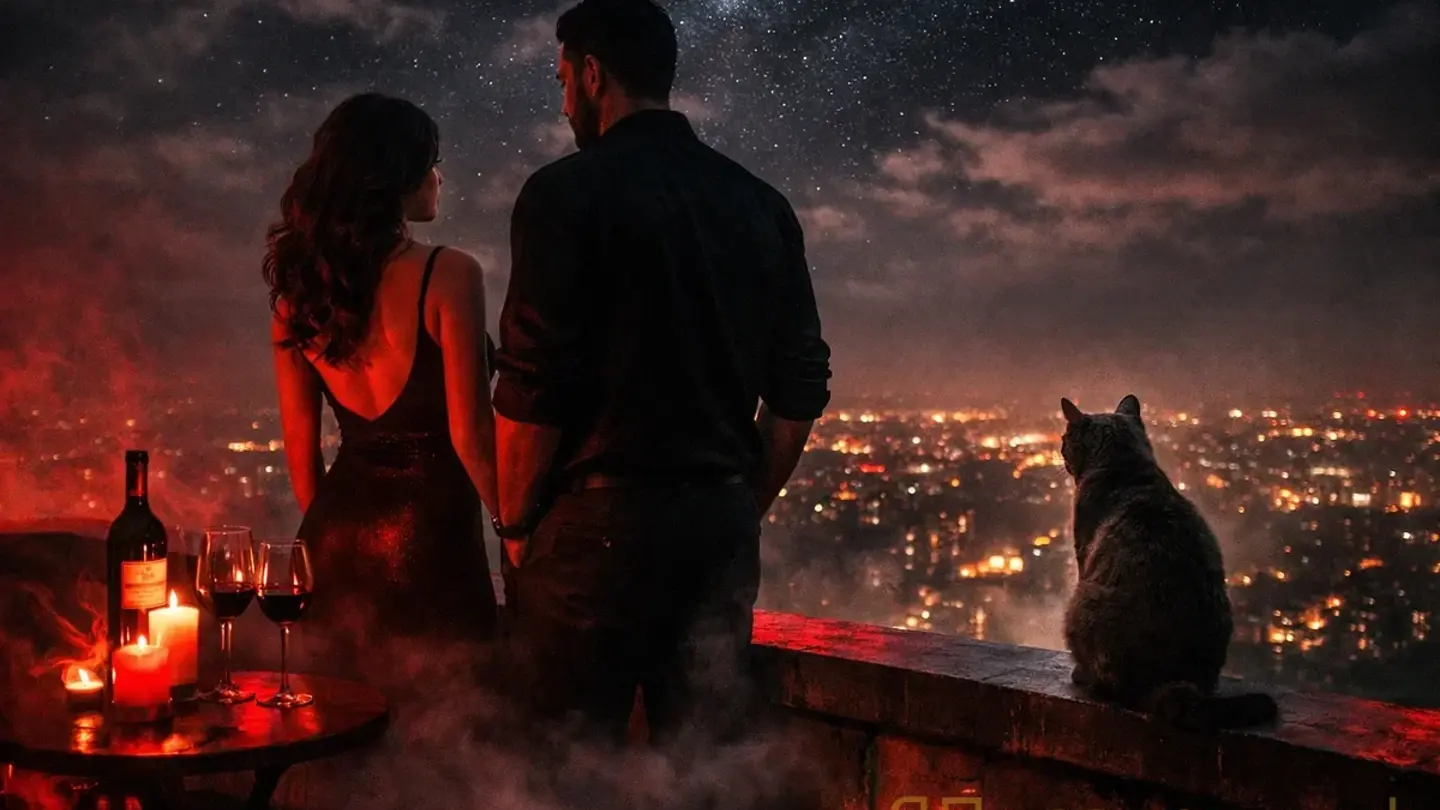 Он встал, не отпуская её руки, и мир вокруг поплыл багровым туманом. Когда он рассеялся, они стояли на крыше — над ночным городом, под небом, полным звёзд, которых не видно сквозь городской смог.