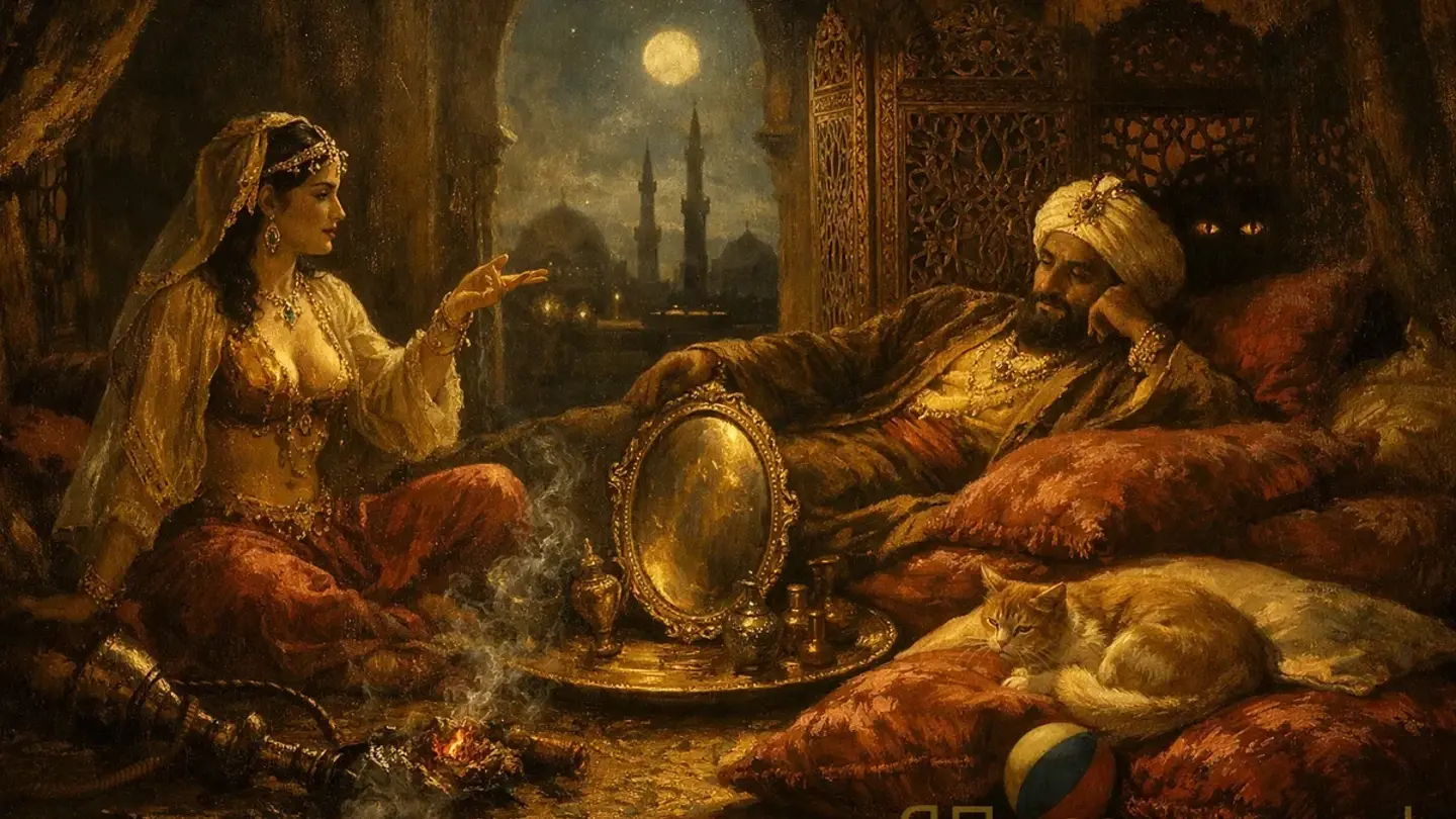 Прошло семь дней после того, как царь Шахрияр помиловал Шахерезаду. Отгремели празднества, смолкли флейты и барабаны, дворцовые залы вновь погрузились в тишину, какая бывает лишь в тех дворцах, где слишком долго лилась кровь. Визири разошлись по покоям, слуги задули лишние светильники, и только луна, бессонная, как старуха-плакальщица, висела над минаретами.