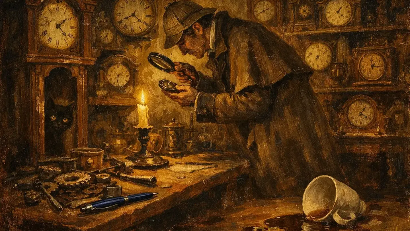 Холмс обошёл мастерскую медленно, останавливаясь у каждых часов. Записывал что-то в блокнот. Потом присел у рабочего стола, достал лупу и принялся изучать поверхность, инструменты, фотографию тела — само тело уже увезли.