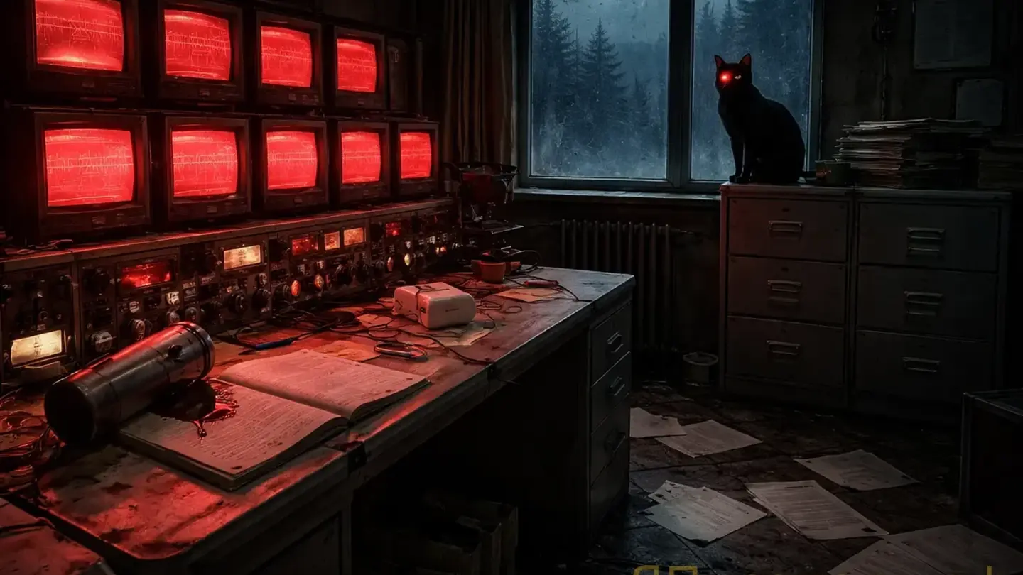 Мониторы потухли. Совсем. Генератор смолк — как отключили. Тишина навалилась: чёрная, плотная, уральская зимняя тишина. Только гул из-под земли. Только вибрация. Только ритм: шаг, пауза, шаг — ближе, ближе, ближе, всё ближе.