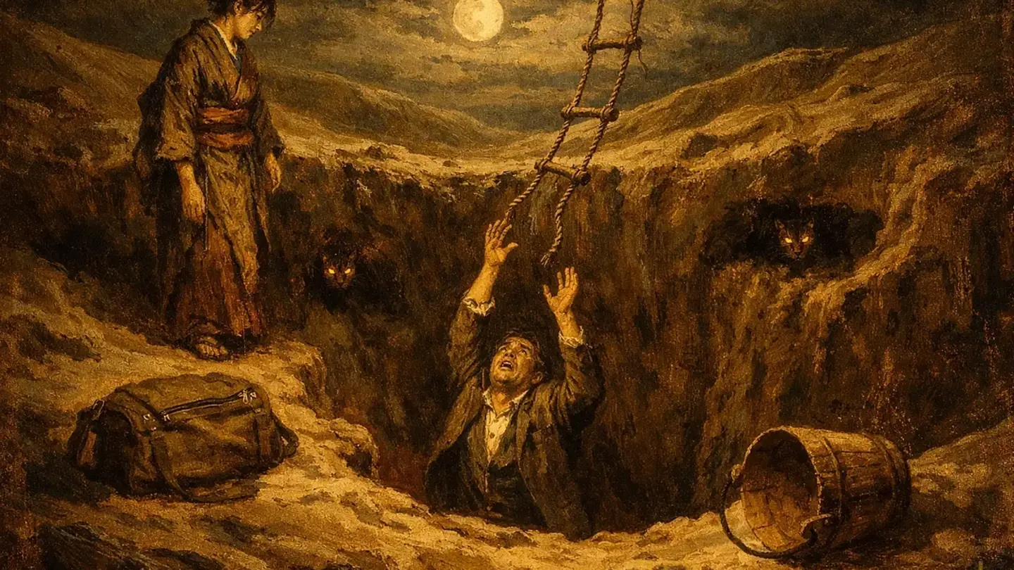 Представьте: вы ищете насекомых в дюнах. Просто так, как хобби. Местные жители зовут переночевать — почему бы нет? А наутро верёвочная лестница, по которой вы спустились в яму к одинокой женщине, исчезает. Всё. Конец. Песок осыпается медленно, неотвратимо — стены ямы нужно расчищать каждую ночь, иначе дом засыплет; женщина объясняет это буднично, как рецепт риса.