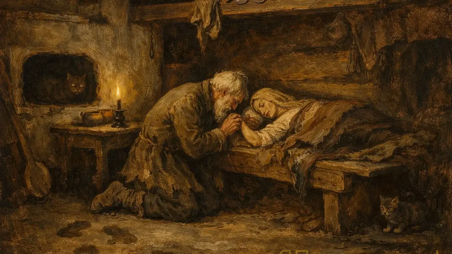 Он вошёл. В избе было темно и душно. На лавке, под тулупом, лежала старая женщина. Лицо её было жёлтым, восковым, но глаза — открыты, и в них ещё теплилась жизнь.