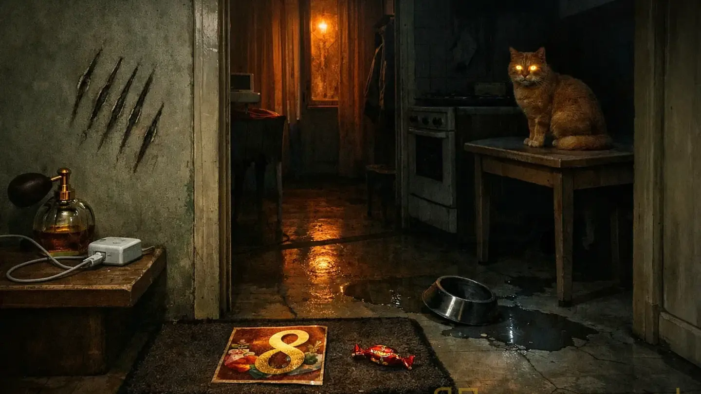 Кот сидел на кухонном столе и смотрел из коридора. Жёлтые глаза, неподвижные. Миска опрокинута. Лужа до порога.