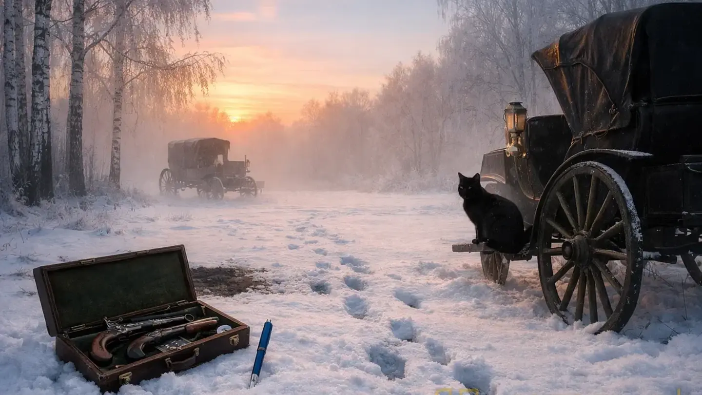 [Видео: ВЫСТРЕЛ! Пьер стреляет, не целясь, зажмурившись — и ПОПАДАЕТ! Долохов падает в снег]