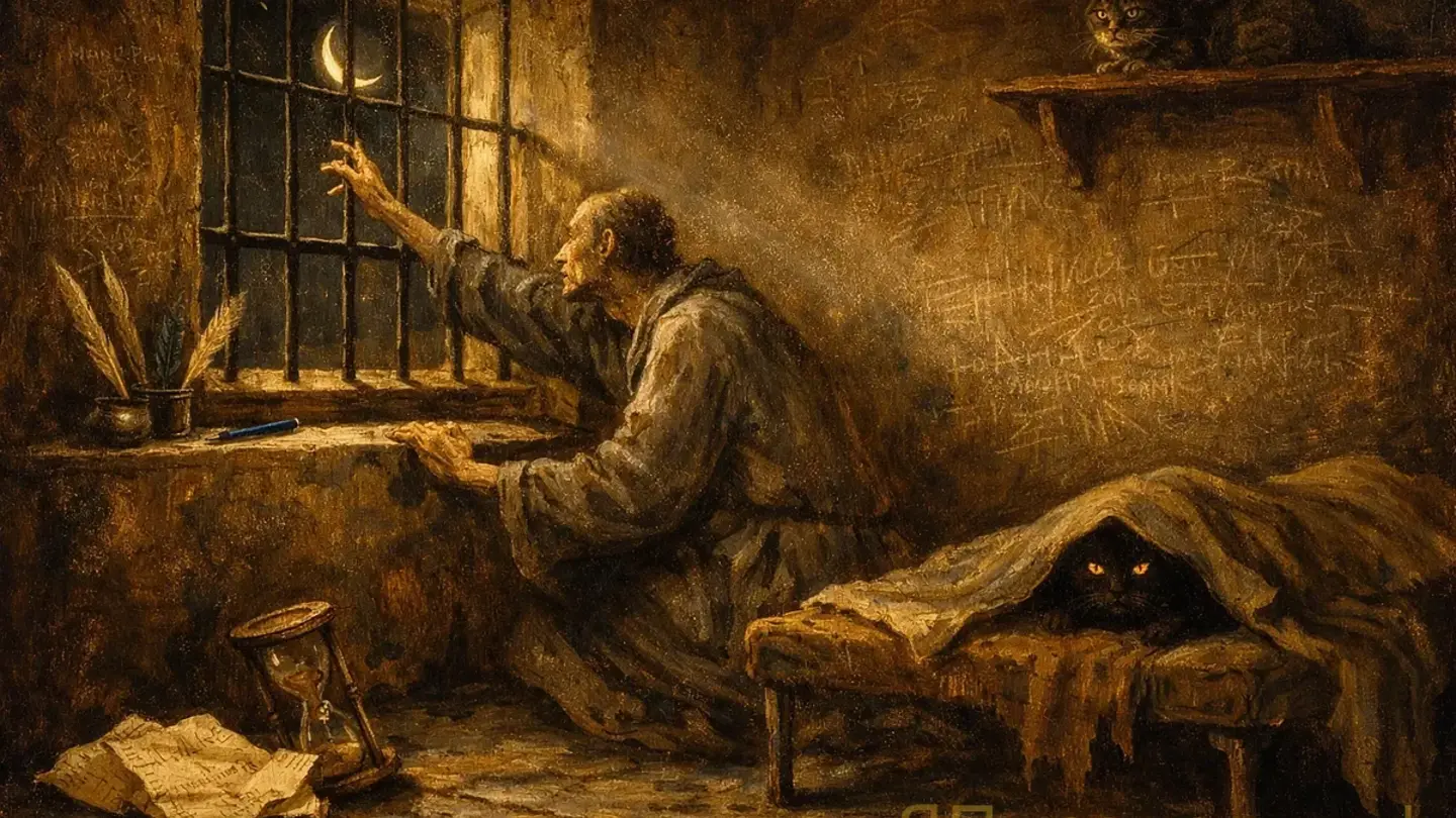 Ночью случилось вот что. Луна — та самая, украденная казначеем — вдруг появилась в окне. Не целая. Кусок. Огрызок, если честно, — как будто кто-то надкусил её и бросил. Я подошёл к окну. Решётка мешала, но я просунул руку между прутьями и — почти дотронулся. Холодная. Луна холодная, как дверная ручка зимой.