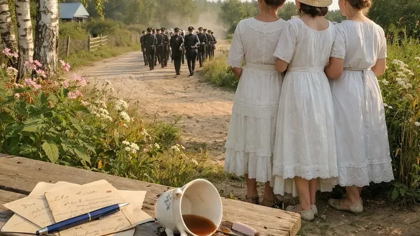 [Фото: Три сестры стоят обнявшись в саду. Вдали уходит военный оркестр. Играет марш]