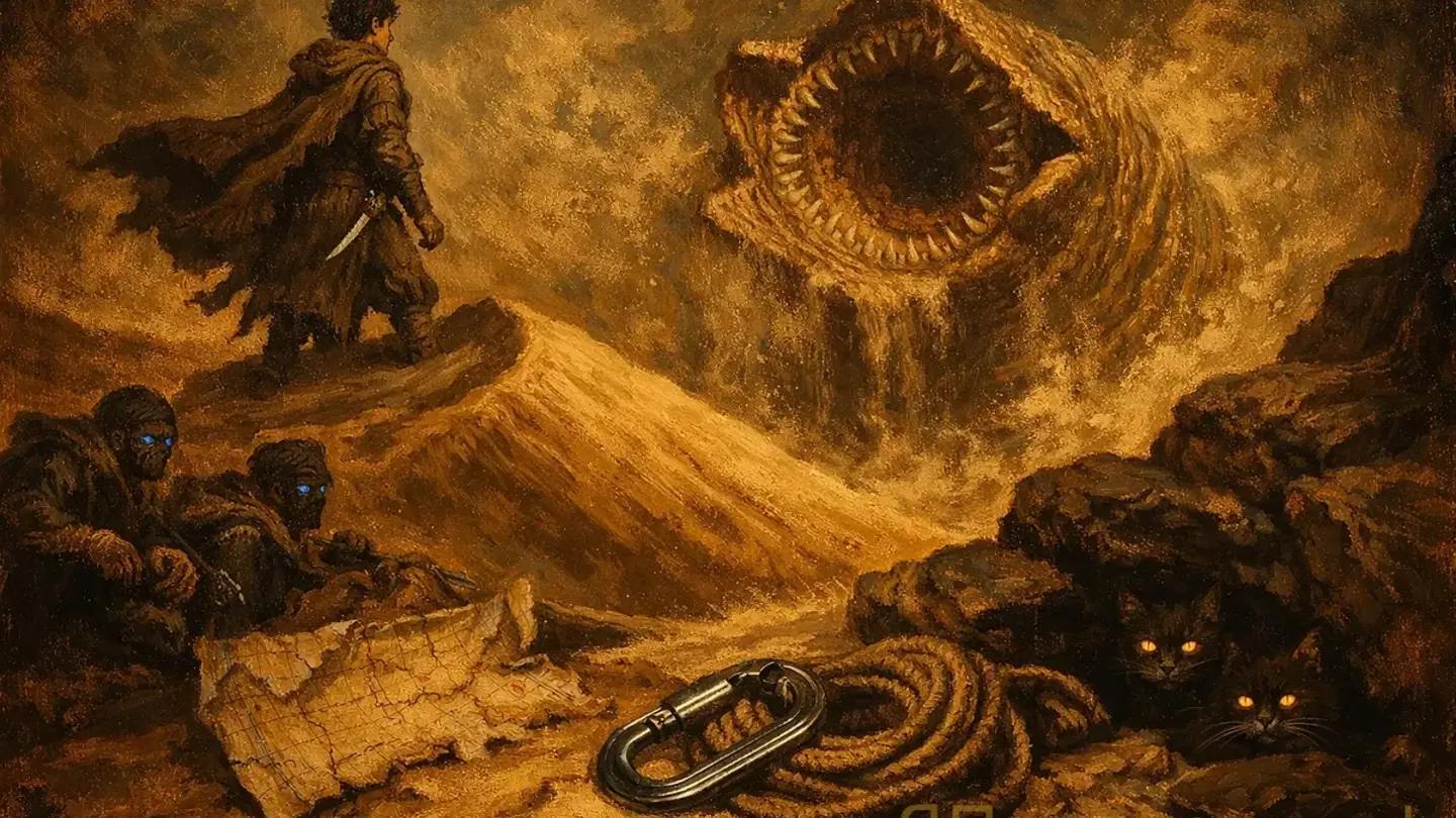 Начну с честного признания. Я бросал эту книгу дважды. Первый раз — на пятидесятой странице, когда Герберт объяснял политику Великих Домов методом, который я называю «учебник политологии в декорациях пустыни». Второй раз — где-то в середине, когда обнаружил, что глоссарий в конце — не приложение для любопытных, а обязательная программа. Без него — как попасть на совещание в чужую компанию в первый день, когда все говорят на своем языке и смотрят на тебя с легким презрением.