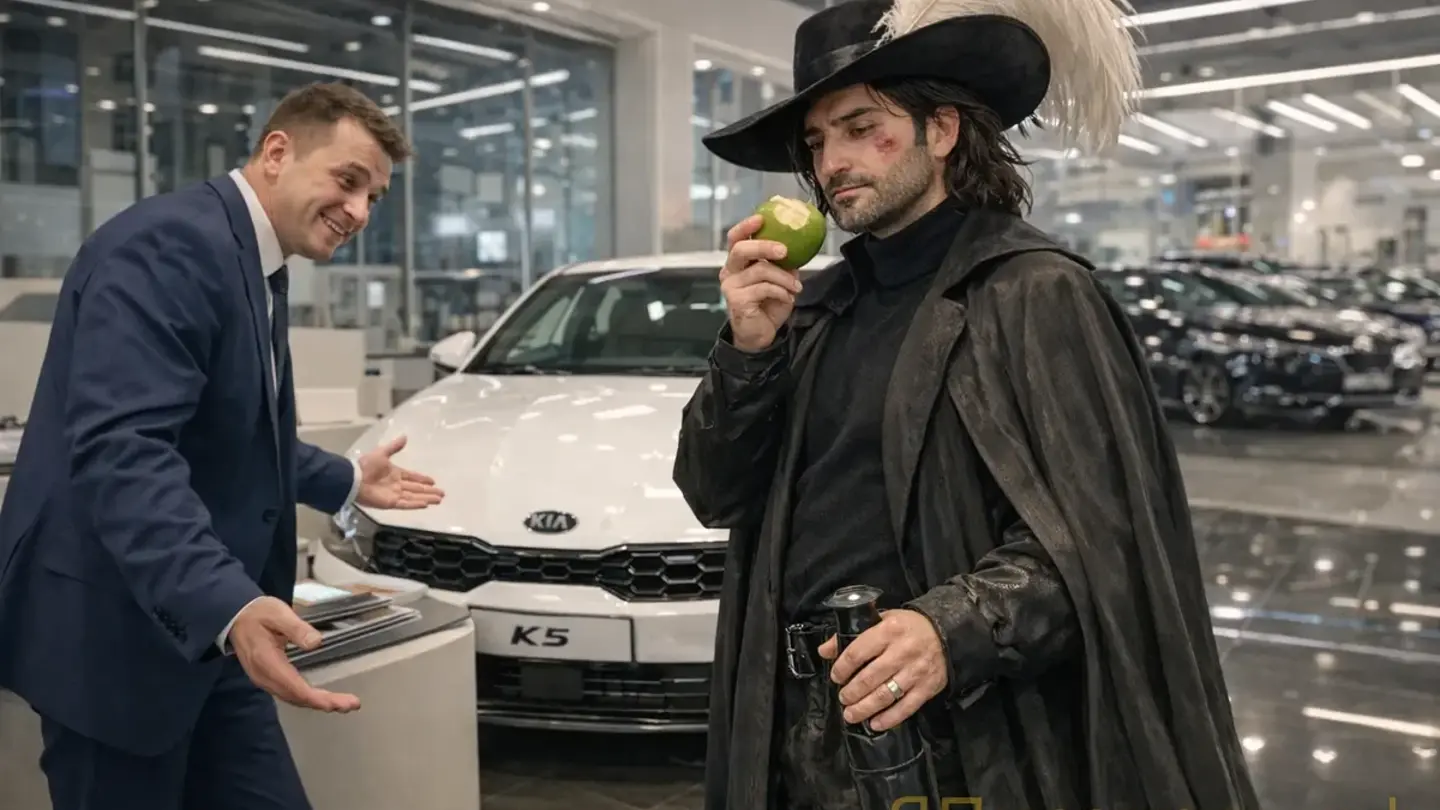 🎬 **[ВИДЕО]** Автосалон «АвтоМир Кутузовский». Чувак лет 35, может 36, волосы до плеч тёмные, в таком, знаете, чёрном длинном плаще. Поверх водолазки. Под левым глазом синяк — не мелкий, видно. И на скуле ссадина такая. В одной руке зелёное яблоко. В другой... чехол. Зонтичный. Но какой-то странно длинный. Менеджер рядом со мной, в костюме, улыбается. Но улыбка неживая. Мужик откусывает. Жует. Смотрит на белую Kia K5 и... качает головой. Просто качает. И говорит: «Нет, друг мой, сей экипаж лишён благородства линий. Покажите мне нечто... с душой».