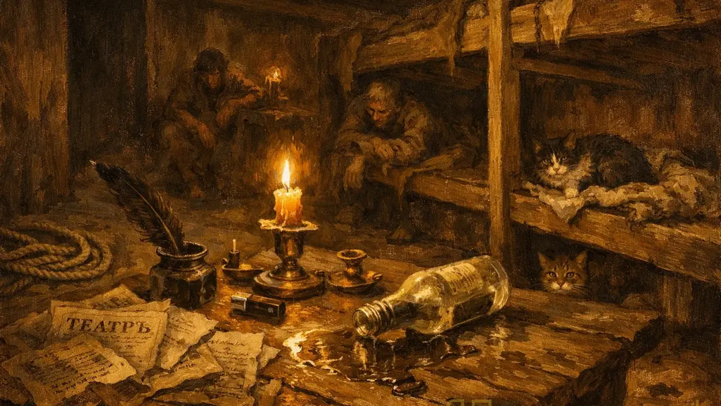 Откуда-то издалека — может быть, из соседней ночлежки, может быть, с улицы — доносится чья-то песня. Другая. Незнакомая. Но такая же тоскливая, протяжная, безнадёжная.