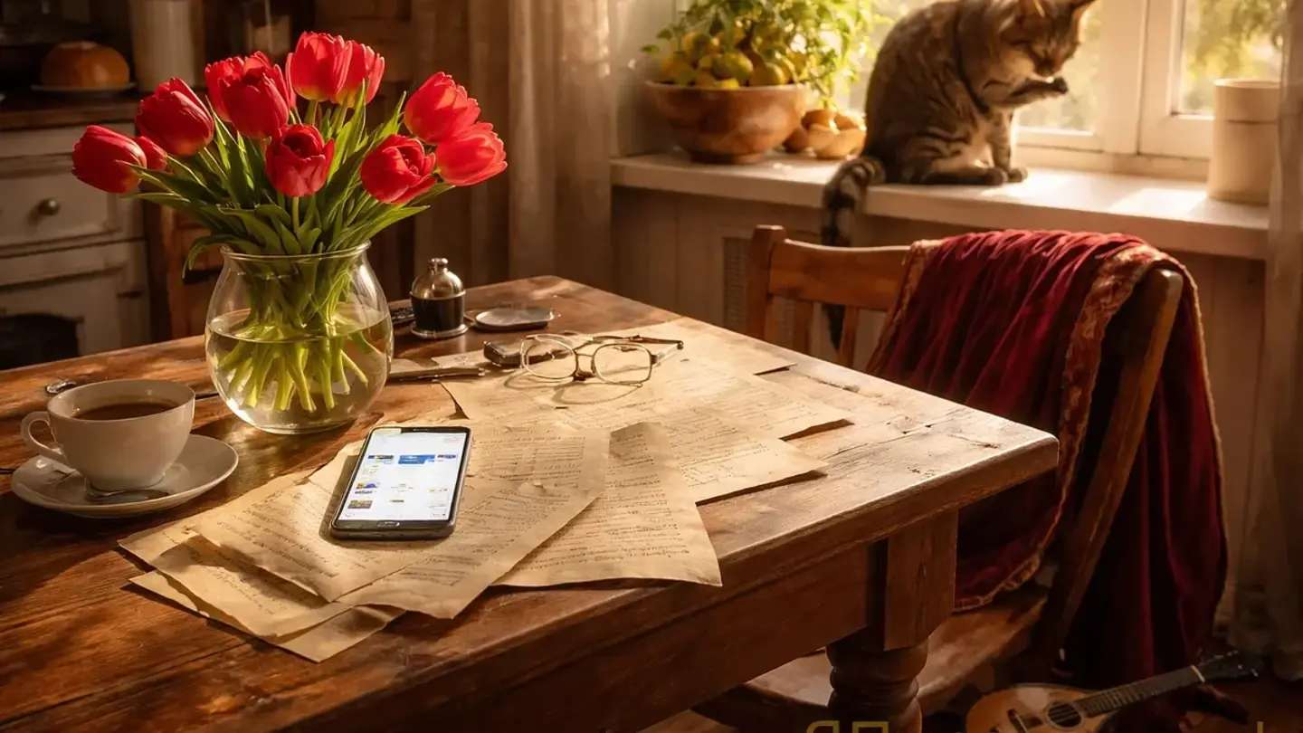 [Девушка в стилизованном платье Ренессанса сидит на кухне. За спиной — холодильник с магнитами из Антальи. На столе — тюльпаны и открытка «С 8 марта!». На экране мелькают кадры из фильма 1967 года с Элизабет Тейлор.]