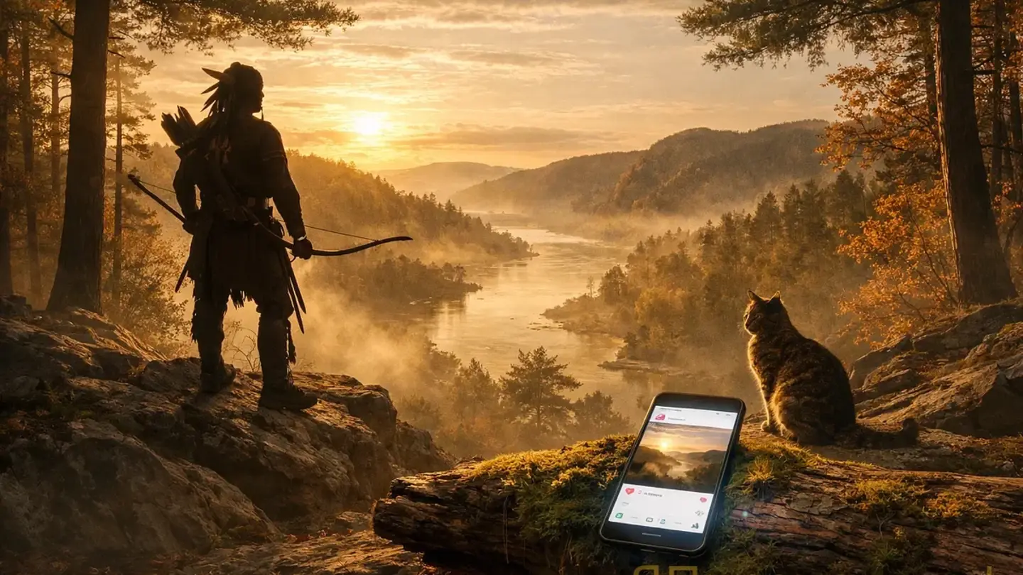 [фото: закат над лесом, огненное небо, силуэт воина на скале]