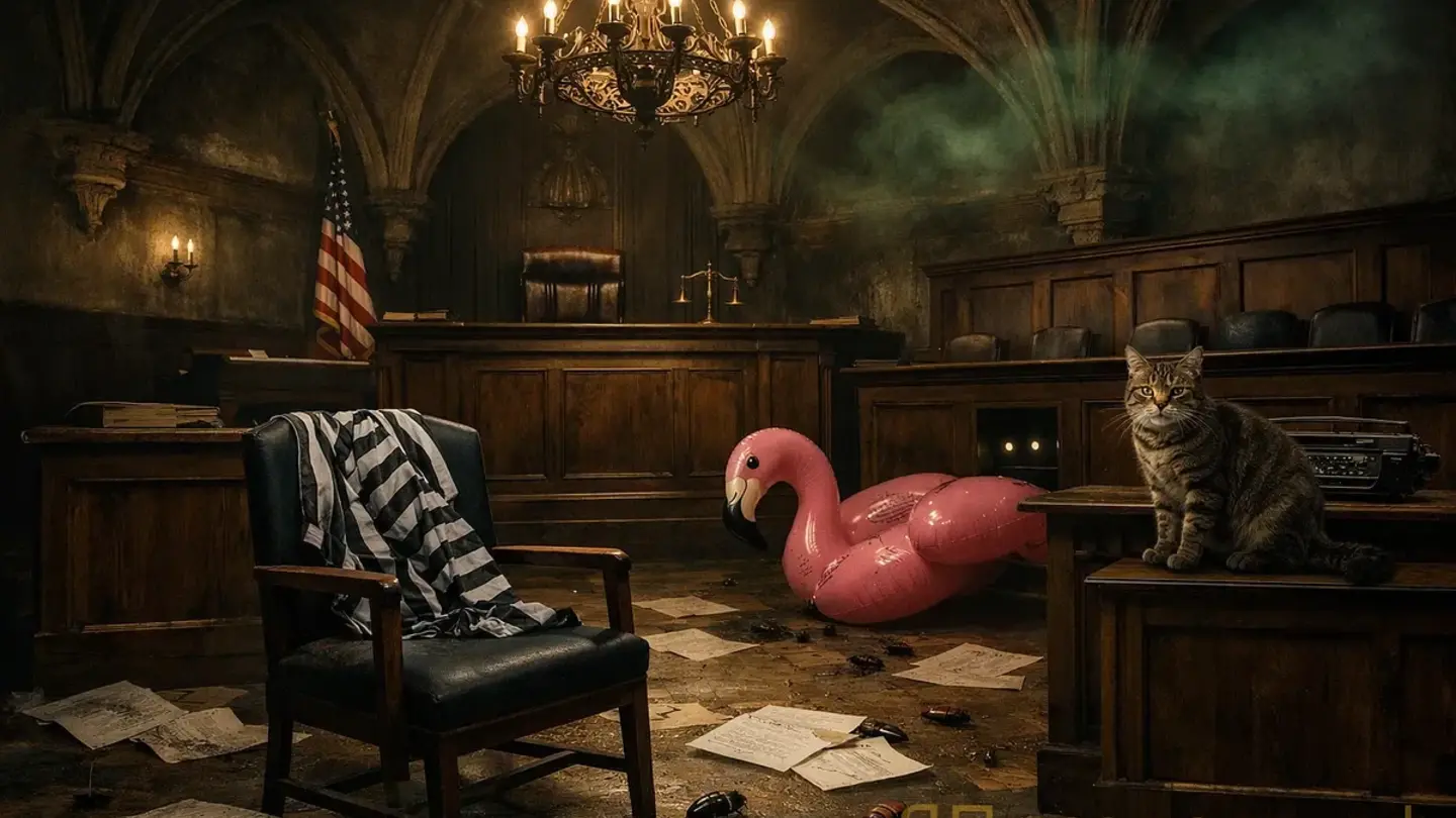 [Стенограмма обрывается. Свет мигнул трижды. Кресло подсудимого пустое. Полосатый пиджак остался. Из кармана выполз жук. Охрана поднята по тревоге. Юнона закурила вторую.]