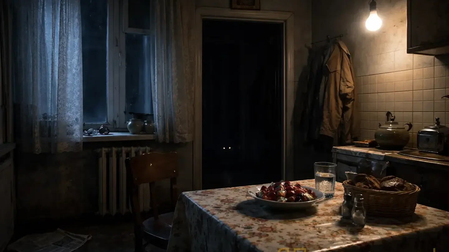 Кухня. Стол, покрытый клеёнкой с маками. Тарелка винегрета — свёкла, горошек, картошка, лук, всё порезано мелко, как баба Валя любила, аккуратно, педантично. Нетронутая. Гранёный стакан с водой, полный до двух третей. Рядом — вилка, салфетка, хлебница с чёрным.